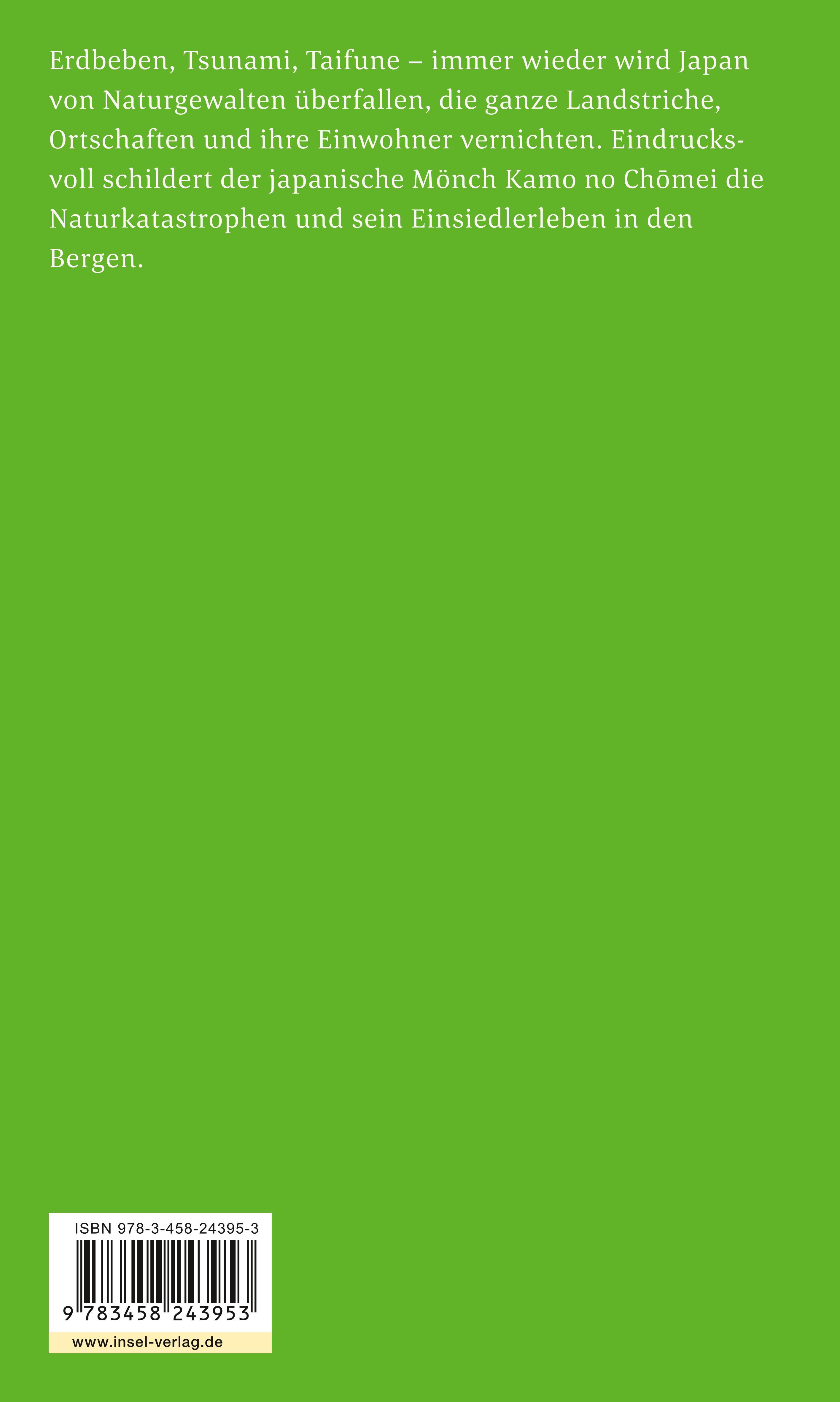 Japan im zwölften Jahrhundert. Großbrände, Wirbelstürme und Erdbeben haben die Hauptstadt Ky to zerstört, Seuchen breiten sich aus, die Leichen der Verhungerten türmen sich an den Straßenrändern. Eindrucksvoll schildert der Mönch Kamo no Ch mei (1155-1216) das Inferno und die Naturkatastrophen, von denen die Hauptstadt heimgesucht wird, das Elend und die Not der Menschen werden lebendig - »all diese Geschehnisse lehrten mich, die Mühsal, in dieser Welt zu leben, die Vergänglichkeit und Zerbrechlichkeit des menschlichen Körpers und der menschlichen Behausungen zu begreifen«.
