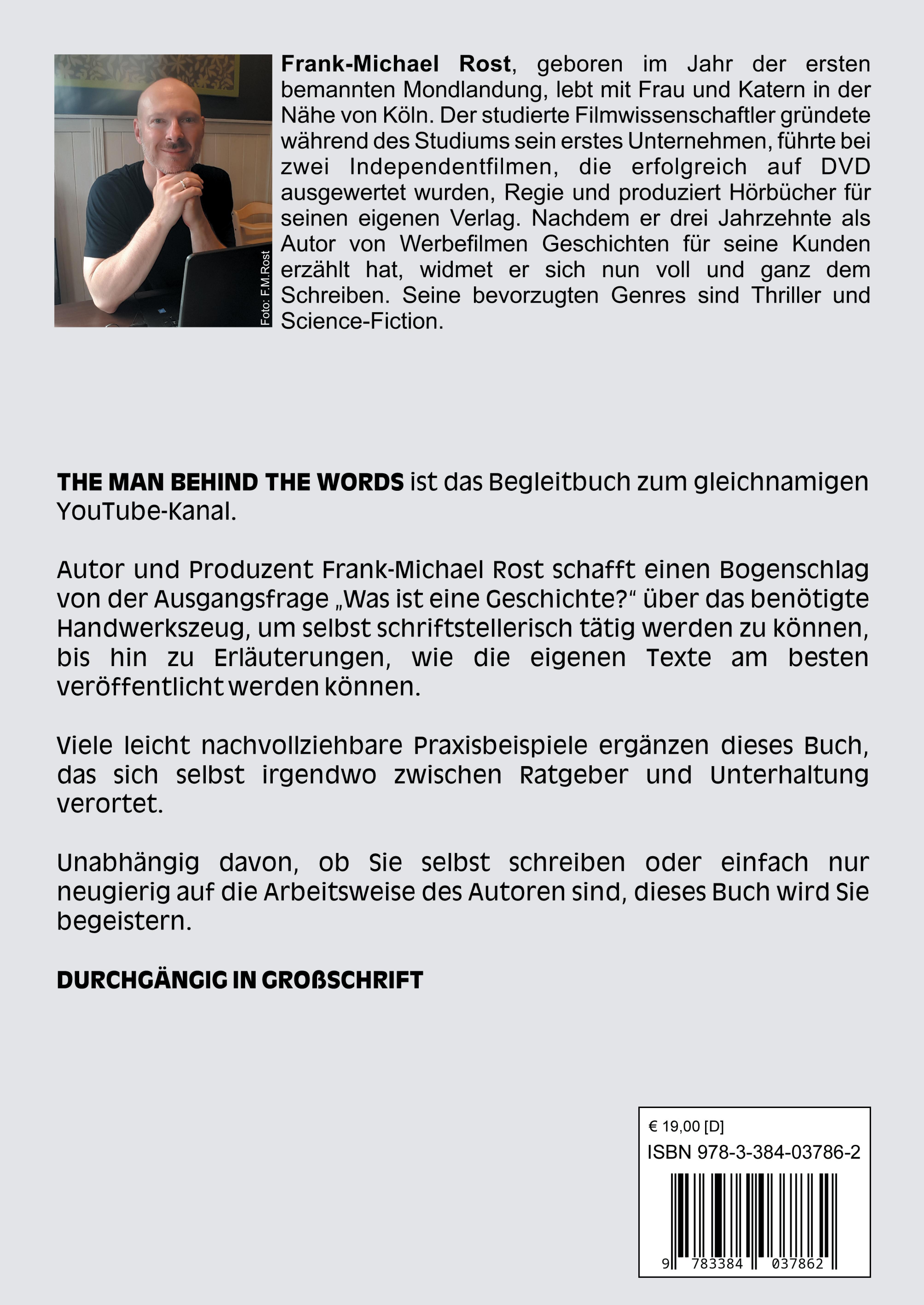 In 100 Tagen zum Roman. Das ist das Versprechen, das Autor und Produzent Frank-Michael Rost mit diesem Sachbuch abgibt. Lerne anhand seiner Arbeitsmethode, wie du dein eigenes Buchprojekt unabhängig vom Genre aus der reinen Vorstellung in gedruckte Form bringen kannst. Mit etwas gutem Willen und Selbstdisziplin kann jeder es schaffen, in 100 Tagen die erste Fassung seines Romans zu schreiben. Trotz Mehrfachbelastung durch Arbeit, Studium oder Familie.Der Autor Autor schafft einen Bogenschlag von der Ausgangsfrage "Was ist eine Geschichte?" über das benötigte Handwerkszeug, um selbst schriftstellerisch tätig werden zu können, bis hin zu Erläuterungen, wie die eigenen Texte am besten veröffentlicht werden können. Viele leicht nachvollziehbare Praxisbeispiele ergänzen dieses Buch, das sich selbst irgendwo zwischen Ratgeber und Unterhaltung verortet. Unabhängig davon, ob du selbst schreibst oder einfach nur neugierig auf die Arbeitsweise des Autoren bist, dieses Buch wird dich begeistern.In insgesamt 5 Kapiteln wird der Weg von der Ideenfindung über die Figurenentwicklung bis hin zur Frage, was Testleser sind und wie du sie für dein Projekt begeistern kannst, vorgestellt. Du erfährst, was du alles benötigst, um dein Manuskript einer Agentur oder einem Verlag anzubieten und wie du den strukturellen Aufbau von Geschichten erkennen und für dein eigenes Schreiben nutzen kannst. Die Informationen sind leicht verständlich und auf den Punkt gebracht. Umfangreichs Vorwissen wird nicht vorausgesetzt. THE MAN BEHIND THE WORDS - In 100 Tagen zum Roman versteht sich als Begleitbuch zum YouTube-Kanal youtube.com/@themanbehindthewords.