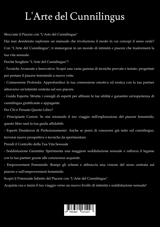Ti sei mai chiesto cosa significhi veramente soddisfare una donna? In "L'Arte del Cunnilingus", ti immergerai in un mondo di piacere e intimità come mai prima d'ora. Con una combinazione di tecniche esperte e approcci sensibili, questo libro è molto più di una guida pratica al sesso orale. È un invito a esplorare la profondità della connessione umana, a comprendere i desideri nascosti del corpo femminile e a celebrare il piacere in tutte le sue forme. Che tu sia un principiante curioso o un amante esperto desideroso di approfondire le proprie conoscenze, "L'Arte del Cunnilingus" offre una prospettiva nuova e avvincente sul sesso e sull'intimità. È il momento di abbracciare il potere del piacere femminile e di portare la tua vita sessuale a nuove altezze di soddisfazione e comprensione. Prendi il controllo della tua vita sessuale e scopri il potenziale infinito del piacere con "L'Arte del Cunnilingus".Incluso nel libro una intera sezione Bonus sull'Eiaculazione Precoce!