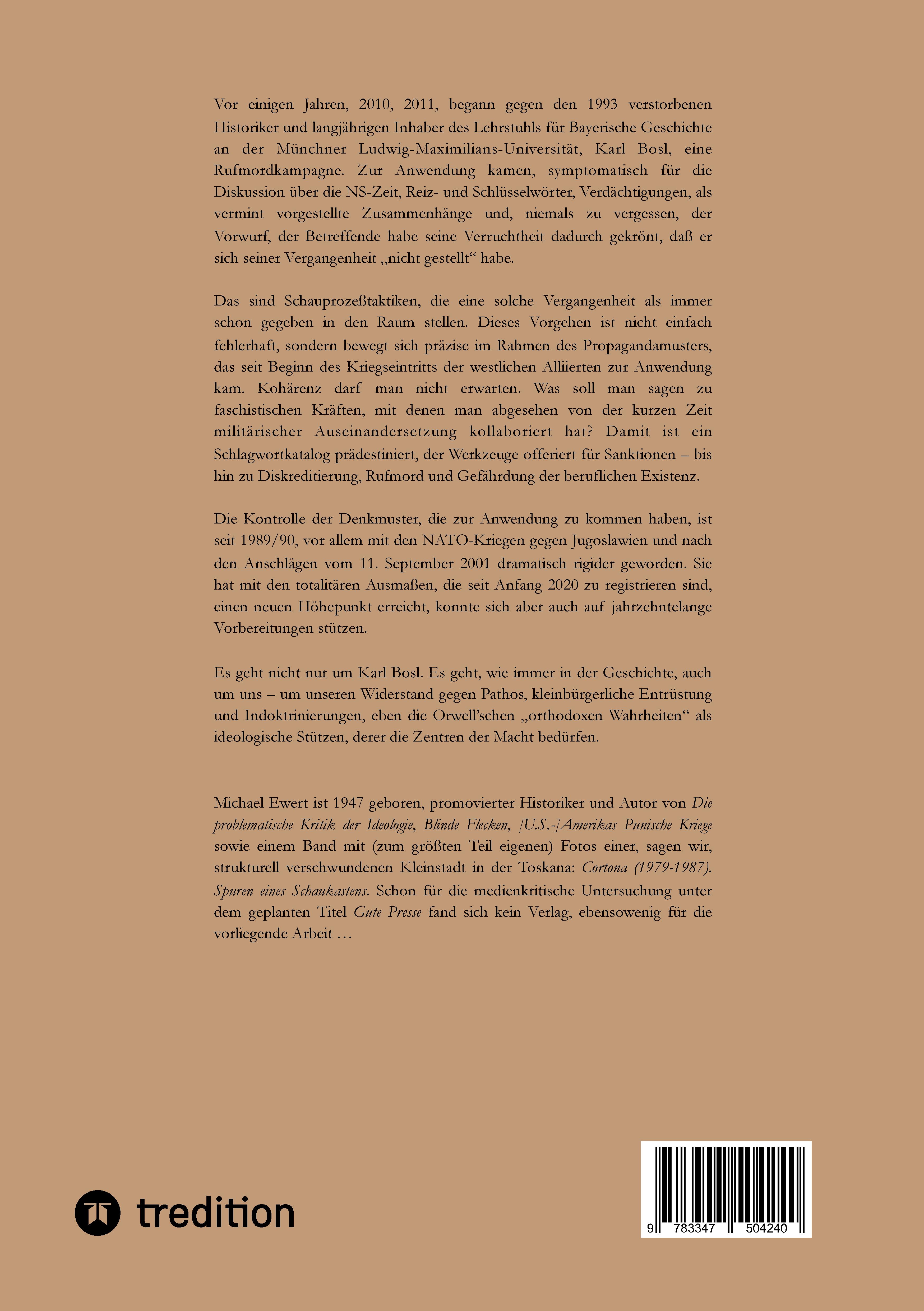 Vor einigen Jahren, 2010, 2011, begann gegen den 1993 verstorbenen Historiker und langjährigen Inhaber des Lehrstuhls für Bayerische Geschichte an der Münchner Ludwig-Maximilians-Universität, Karl Bosl, eine Rufmord-kampagne. Zur Anwendung kamen, symptomatisch für die Diskussion über die NS-Zeit, Reiz- und Schlüsselwörter, Verdächtigungen, als vermint vorgestellte Zusammenhänge und, niemals zu vergessen, der Vorwurf, der Betreffende habe seine Verruchtheit dadurch gekrönt, daß er sich seiner Vergangenheit "nicht gestellt" habe.Das sind Schauprozeßtaktiken, die eine solche Vergangenheit als immer schon gegeben in den Raum stellen. Dieses Vorgehen ist nicht einfach fehlerhaft, sondern bewegt sich präzise im Rahmen des Propagandamusters, das seit Beginn des Kriegseintritts der westlichen Alliierten zur Anwendung kam. Kohärenz darf man nicht erwarten. Was soll man sagen zu faschistischen Kräften, mit denen man abgesehen von der kurzen Zeit militärischer Ausein-andersetzung kollaboriert hat? Damit ist ein Schlagwortkatalog prädestiniert, der Werkzeuge offeriert für Sanktionen - bis hin zu Diskreditierung, Rufmord und Gefährdung der beruflichen Existenz. Die Kontrolle der Denkmuster, die zur Anwendung zu kommen haben, ist seit 1989/90, vor allem mit den NATO-Kriegen gegen Jugoslawien und nach den Anschlägen vom 11. September 2001 dramatisch rigider geworden. Sie hat mit den totalitären Ausmaßen, die seit Anfang 2020 zu registrieren sind, einen neuen Höhepunkt erreicht, konnte sich aber auch auf jahrzehntelange Vorbereitungen stützen.Es geht nicht nur um Karl Bosl. Es geht, wie immer in der Geschichte, auch um uns - um unseren Widerstand gegen Pathos, kleinbürgerliche Entrüstung und Indoktrinierungen, eben die Orwell'schen "orthodoxen Wahrheiten" als ideologische Stützen, derer die Zentren der Macht bedürfen.