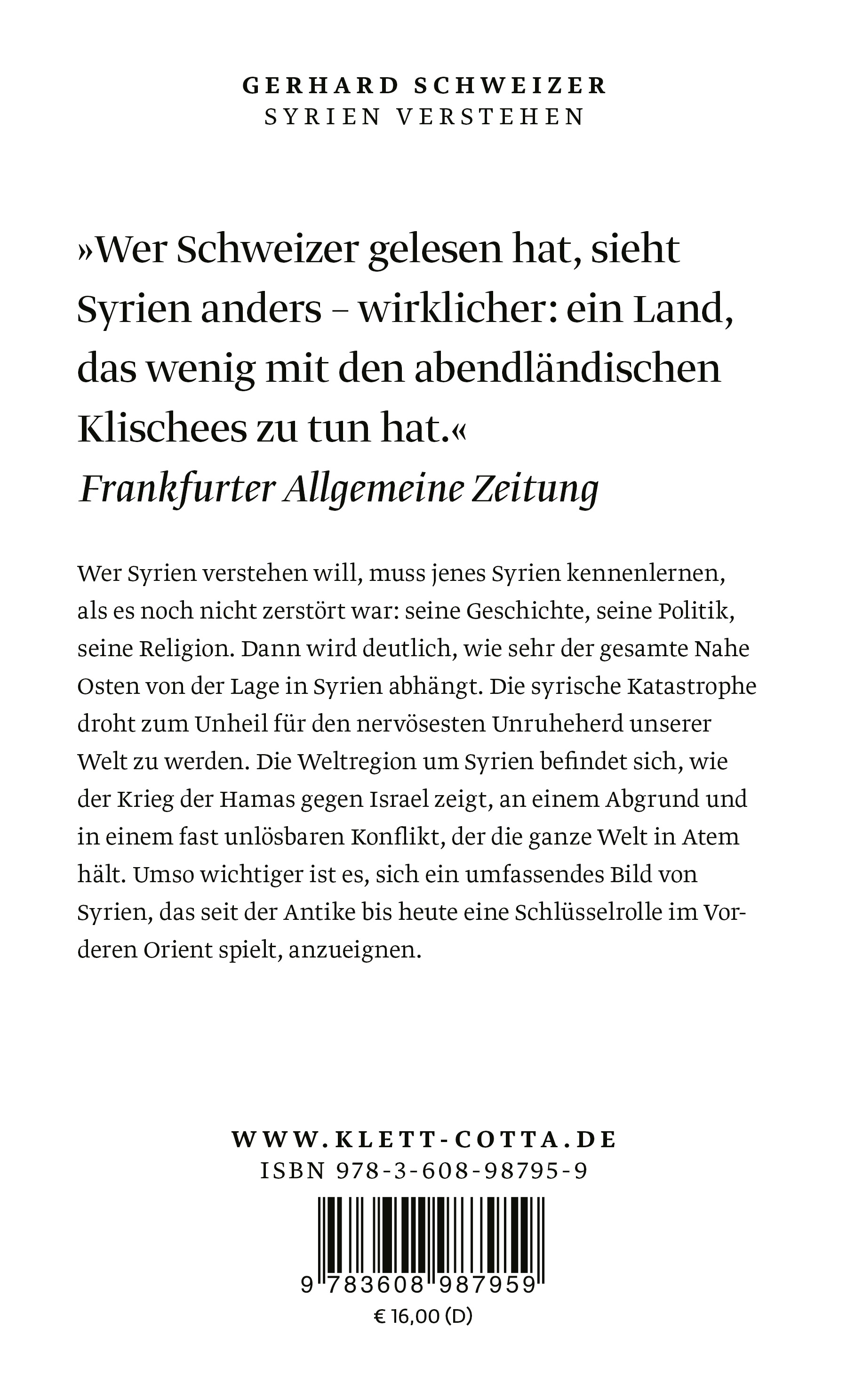 Wer Syrien verstehen will, muss jenes Syrien kennenlernen, als es noch nicht zerstört war: seine Geschichte, seine Politik, seine Religion. Dann wird deutlich, wie sehr der gesamte Nahe Osten von der Lage in Syrien abhängt. Die syrische Katastrophe droht zum Unheil für den nervösesten Unruheherd unserer Welt zu werden. Die Weltregion um Syrien befindet sich, wie der Krieg der Hamas gegen Israel zeigt, an einem Abgrund und in einem fast unlösbaren Konflikt, der die ganze Welt in Atem hält. Umso wichtiger ist es, sich ein umfassendes Bild von Syrien, das seit der Antike bis heute eine Schlüsselrolle im Vorderen Orient spielt, anzueignen.