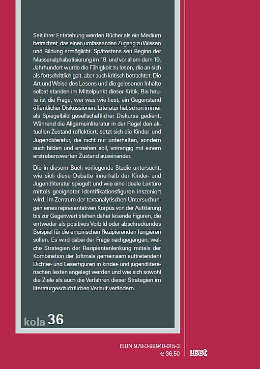 Die in diesem Buch vorliegende Studie untersucht, wie sich diese Debatte innerhalb der Kinder- und Jugendliteratur spiegelt und wie eine ideale Lektüre mittels geeigneter Identifikationsfiguren inszeniert wird. Im Zentrum der textanalytischen Untersuchungen eines repräsentativen Korpus von der Aufklärung bis zur Gegenwart stehen daher lesende Figuren, die entweder als positives Vorbild oder abschreckendes Beispiel für die empirischen Rezipierenden fungieren sollen. Es wird dabei der Frage nachgegangen, welche Strategien der Rezipientenlenkung mittels der Kombination der (oftmals gemeinsam auftretenden) Dichter- und Leserfiguren in kinder- und jugendliterarischen Texten angelegt werden und wie sich sowohl die Ziele als auch die Verfahren dieser Strategien im literaturgeschichtlichen Verlauf verändern.