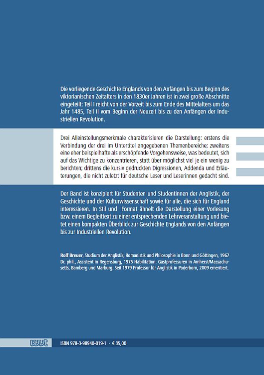 Der Band ist konzipiert für Studenten und Studentinnen der Anglistik, der Geschichte und der Kulturwissenschaft sowie für alle, die sich für die englische Geschichte interessieren. In Stil und Format ähnelt die Darstellung einer Vorlesung bzw. einem Begleittext zu einer entsprechenden Lehrveranstaltung und bietet einen kompakten Überblick zur Geschichte Englands von den Anfängen bis zur Industriellen Revolution.
