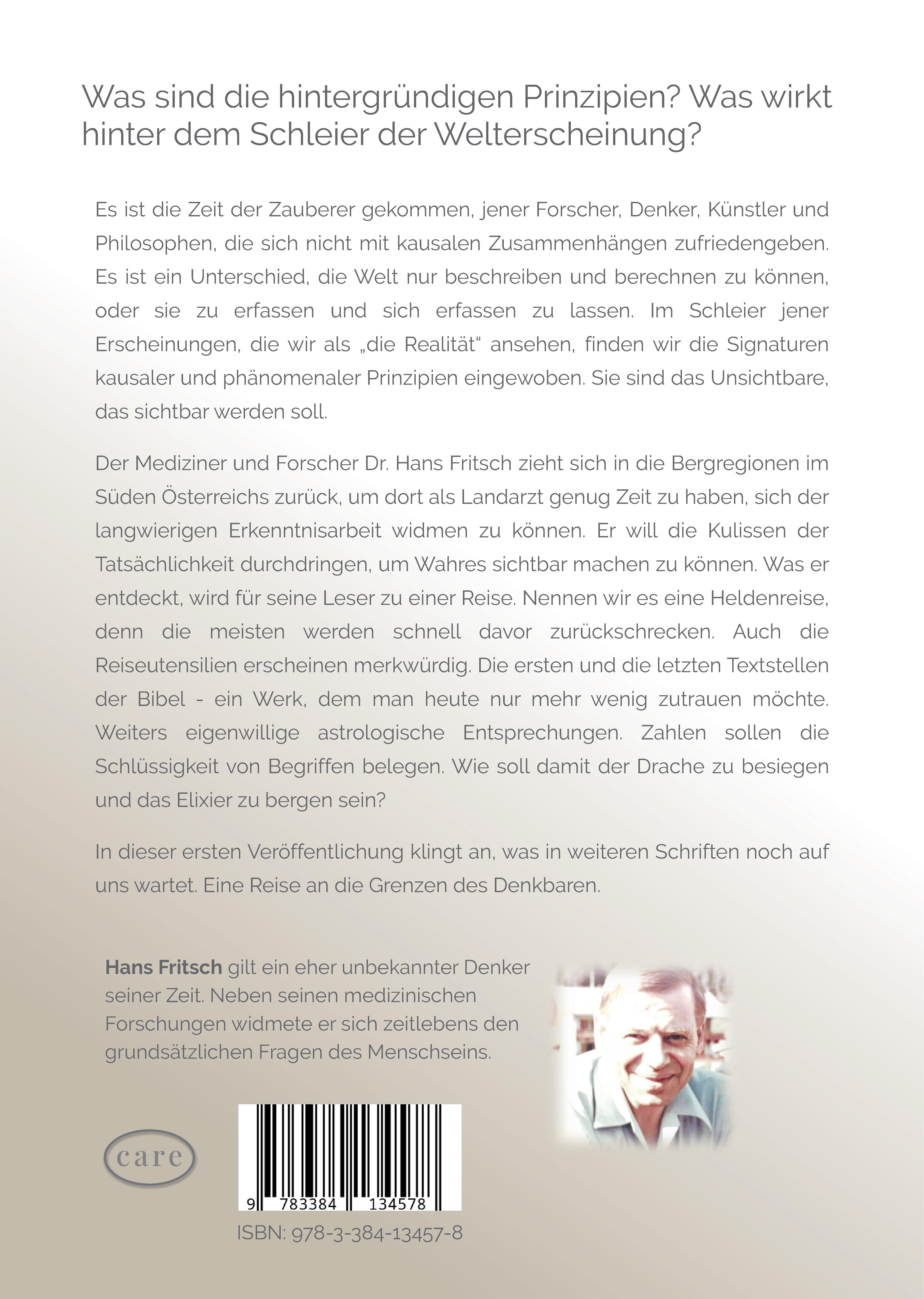Dr. Hans (Johann Friedrich Egon) Fritsch (1915-1981) zieht sich als Landarzt in ein Bergdorf im Süden Österreichs zurück, wo er mit seiner ersten und später zweiten Familie lebt. Dort entwickelt er nicht nur eine besondere, noch unveröffentlichten Pflanzenmedizin, sondern sucht besonders nach Hintergründen und tieferen Wahrheiten. Er arbeitet zeitlebens einem Konzept, das die Fähigkeit des menschlichen Geistes zur Erkenntnis unterstützen soll. Wie andere das Leben feiern wollen, so will er in seinen Arbeiten die Hintergründe des Lebens begreifen und im gleichzeitigen Ergriffen-Sein das Leben auf eine besondere Art feiern. Dort wo Wissen, Glauben und Erkenntnis mit dem Willen eines ernsthaft Suchenden zusammenkommen, gibt es Momente, in denen ein Lichtbogen die mal stimmigeren und oftmals auch unstimmigen Gedanken und Werke zum Leuchten bringt. Diese Kraft ist in seinen Texten immer wieder spürbar - diese wertvolle Essenz die sich Philosophen, Künstler und ernsthaft Gläubige zu teilen scheinen. So findet im Begrenzten das Unbegrenzte seinen Platz und Raum - zu seiner Zeit.