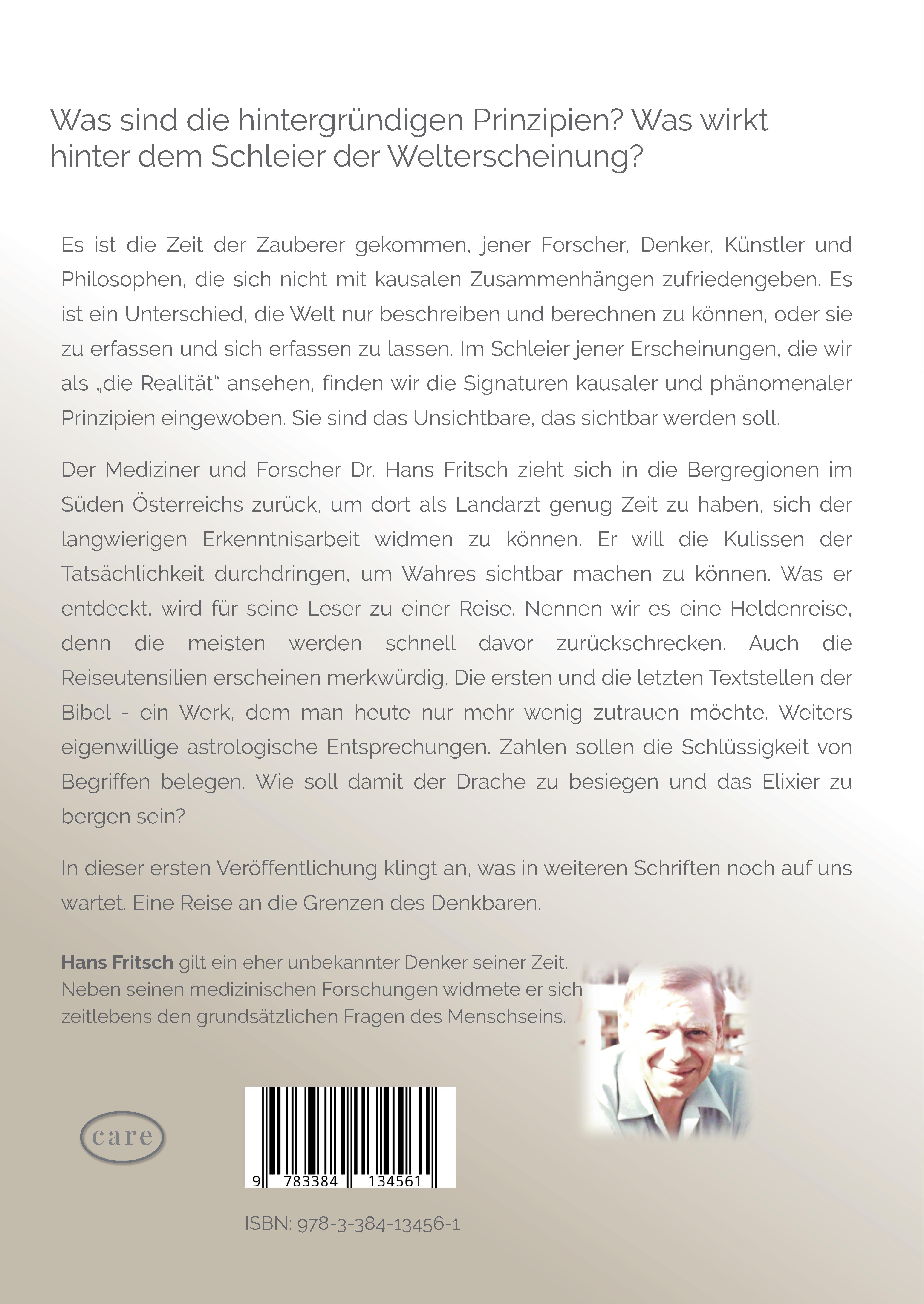 Dr. Hans (Johann Friedrich Egon) Fritsch (1915-1981) zieht sich als Landarzt in ein Bergdorf im Süden Österreichs zurück, wo er mit seiner ersten und später zweiten Familie lebt. Dort entwickelt er nicht nur eine besondere, noch unveröffentlichten Pflanzenmedizin, sondern sucht besonders nach Hintergründen und tieferen Wahrheiten. Er arbeitet zeitlebens einem Konzept, das die Fähigkeit des menschlichen Geistes zur Erkenntnis unterstützen soll. Wie andere das Leben feiern wollen, so will er in seinen Arbeiten die Hintergründe des Lebens begreifen und im gleichzeitigen Ergriffen-Sein das Leben auf eine besondere Art feiern. Dort wo Wissen, Glauben und Erkenntnis mit dem Willen eines ernsthaft Suchenden zusammenkommen, gibt es Momente, in denen ein Lichtbogen die mal stimmigeren und oftmals auch unstimmigen Gedanken und Werke zum Leuchten bringt. Diese Kraft ist in seinen Texten immer wieder spürbar - diese wertvolle Essenz die sich Philosophen, Künstler und ernsthaft Gläubige zu teilen scheinen. So findet im Begrenzten das Unbegrenzte seinen Platz und Raum - zu seiner Zeit.