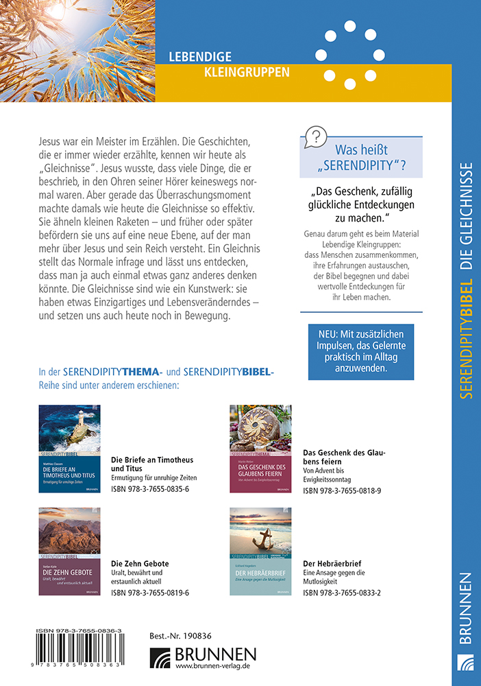 In diesem Serendipity-Hauskreisheft zu den Gleichnissen werden ausgewählte Bibeltexte aus dem Matthäus-, Markus- und Lukasevangelium des Neuen Testaments behandelt. Es enthält 13 gut aufbereitete Studieneinheiten und umfasst Einstiegsfragen, einen Bibeltext nach der Neuen Genfer Übersetzung und weiterführende Fragen, die helfen, den Inhalt zu erschließen und besser zu verstehen. Vertiefende Erläuterungen runden die einzelnen Kapitel ab: Das ist "Bibel verstehen leicht gemacht". Ein ideales Arbeits- und Studienmaterial für Klein- und Gesprächsgruppen sowie Bibelkreise - auch geeignet zum Selbststudium.