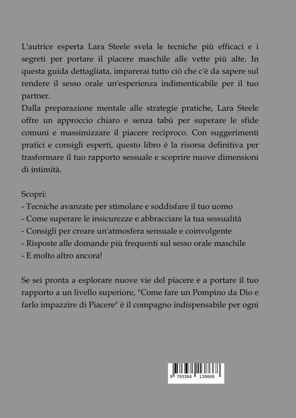 Lara Steel nasce a New York da genitori italiani, che le trasmettono un profondo senso di famiglia e un'insaziabile curiosità per il mondo. Trascorre la sua infanzia e adolescenza nel New Jersey, dove si immerge nella lettura di libri di ogni genere, nutrendo la sua immaginazione e affinando la sua abilità di scrittura. Fin dalla giovane età, Lara si distingue per la sua passione per la scrittura. Inventa storie fantastiche, scrive poesie e racconti, esplorando diversi generi letterari. La sua penna è vivace, capace di catturare l'essenza delle emozioni e di trasportarla su carta. Dopo aver conseguito la laurea, Lara decide di dedicarsi completamente alla scrittura. Il suo esordio avviene con un romanzo erotico che conquista subito il pubblico, affermandosi come una voce fresca e originale nel panorama letterario. La sua penna non si limita al solo genere erotico. Lara spazia con disinvoltura dal romance al fantasy, fino alla fantascienza, creando mondi immaginari ricchi di dettagli e personaggi indimenticabili. Oltre alla narrativa, Lara si dedica anche alla scrittura di guide di sessuologia. Il suo approccio è chiaro, diretto e privo di tabù, con l'obiettivo di fornire informazioni accurate e utili per una vita sessuale appagante. Lara è una donna poliedrica e impegnata. Promuove l'amore per la lettura e la scrittura attraverso eventi e conferenze, ed è una sostenitrice di diverse cause sociali. Attualmente Lara vive nella capitale del Maine, dove trova la tranquillità necessaria per dedicarsi alle sue passioni: la scrittura, la lettura e la natura. La sua casa è un rifugio accogliente, pieno di libri e di ricordi dei suoi viaggi in giro per il mondo. Con il suo talento e la sua tenacia, Lara Steel si è affermata come una delle autrici più innovative e apprezzate del panorama contemporaneo. Le sue opere continuano ad appassionare lettori di tutto il mondo, offrendo loro storie coinvolgenti, personaggi memorabili e spunti di riflessione. La creatività di Lara Steel non ha confini. Il suo futuro è pieno di nuove sfide e progetti entusiasmanti, che promettono di regalare ai suoi lettori ancora tante emozioni e sorprese.