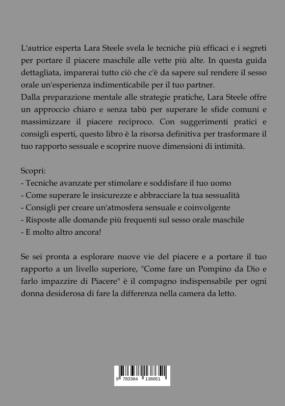 Lara Steel nasce a New York da genitori italiani, che le trasmettono un profondo senso di famiglia e un'insaziabile curiosità per il mondo. Trascorre la sua infanzia e adolescenza nel New Jersey, dove si immerge nella lettura di libri di ogni genere, nutrendo la sua immaginazione e affinando la sua abilità di scrittura. Fin dalla giovane età, Lara si distingue per la sua passione per la scrittura. Inventa storie fantastiche, scrive poesie e racconti, esplorando diversi generi letterari. La sua penna è vivace, capace di catturare l'essenza delle emozioni e di trasportarla su carta. Dopo aver conseguito la laurea, Lara decide di dedicarsi completamente alla scrittura. Il suo esordio avviene con un romanzo erotico che conquista subito il pubblico, affermandosi come una voce fresca e originale nel panorama letterario. La sua penna non si limita al solo genere erotico. Lara spazia con disinvoltura dal romance al fantasy, fino alla fantascienza, creando mondi immaginari ricchi di dettagli e personaggi indimenticabili. Oltre alla narrativa, Lara si dedica anche alla scrittura di guide di sessuologia. Il suo approccio è chiaro, diretto e privo di tabù, con l'obiettivo di fornire informazioni accurate e utili per una vita sessuale appagante. Lara è una donna poliedrica e impegnata. Promuove l'amore per la lettura e la scrittura attraverso eventi e conferenze, ed è una sostenitrice di diverse cause sociali. Attualmente Lara vive nella capitale del Maine, dove trova la tranquillità necessaria per dedicarsi alle sue passioni: la scrittura, la lettura e la natura. La sua casa è un rifugio accogliente, pieno di libri e di ricordi dei suoi viaggi in giro per il mondo. Con il suo talento e la sua tenacia, Lara Steel si è affermata come una delle autrici più innovative e apprezzate del panorama contemporaneo. Le sue opere continuano ad appassionare lettori di tutto il mondo, offrendo loro storie coinvolgenti, personaggi memorabili e spunti di riflessione. La creatività di Lara Steel non ha confini. Il suo futuro è pieno di nuove sfide e progetti entusiasmanti, che promettono di regalare ai suoi lettori ancora tante emozioni e sorprese.