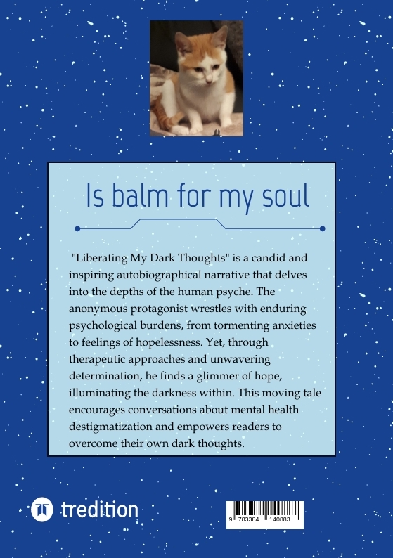 The book addresses the central theme of mental health and provides an in-depth look into the protagonist's individual struggles with dark thoughts, depression and anxiety. By honestly portraying these inner conflicts, it allows the reader to understand the complexity and pain of these experiences.In addition, the book illuminates the path to healing and freedom from these stressful thoughts through various therapeutic approaches, the supportive influence of loving people in the protagonist's life, and his own unshakable will to help himself. It emphasizes the importance of self-care, self-reflection and seeking support when dealing with psychological stress.Another important aspect of the book is its appeal to society to take mental health seriously and support it. It calls for breaking the stigma surrounding mental health issues and creating an open and supportive environment for those affected.Overall, the book offers an inspiring and moving narrative of the spirit's triumph over darkness and encourages readers to acknowledge, embrace, and overcome their own dark thoughts. It is a story of hope, resilience and courage that encourages you to nurture your own mental health and support others in their struggles.