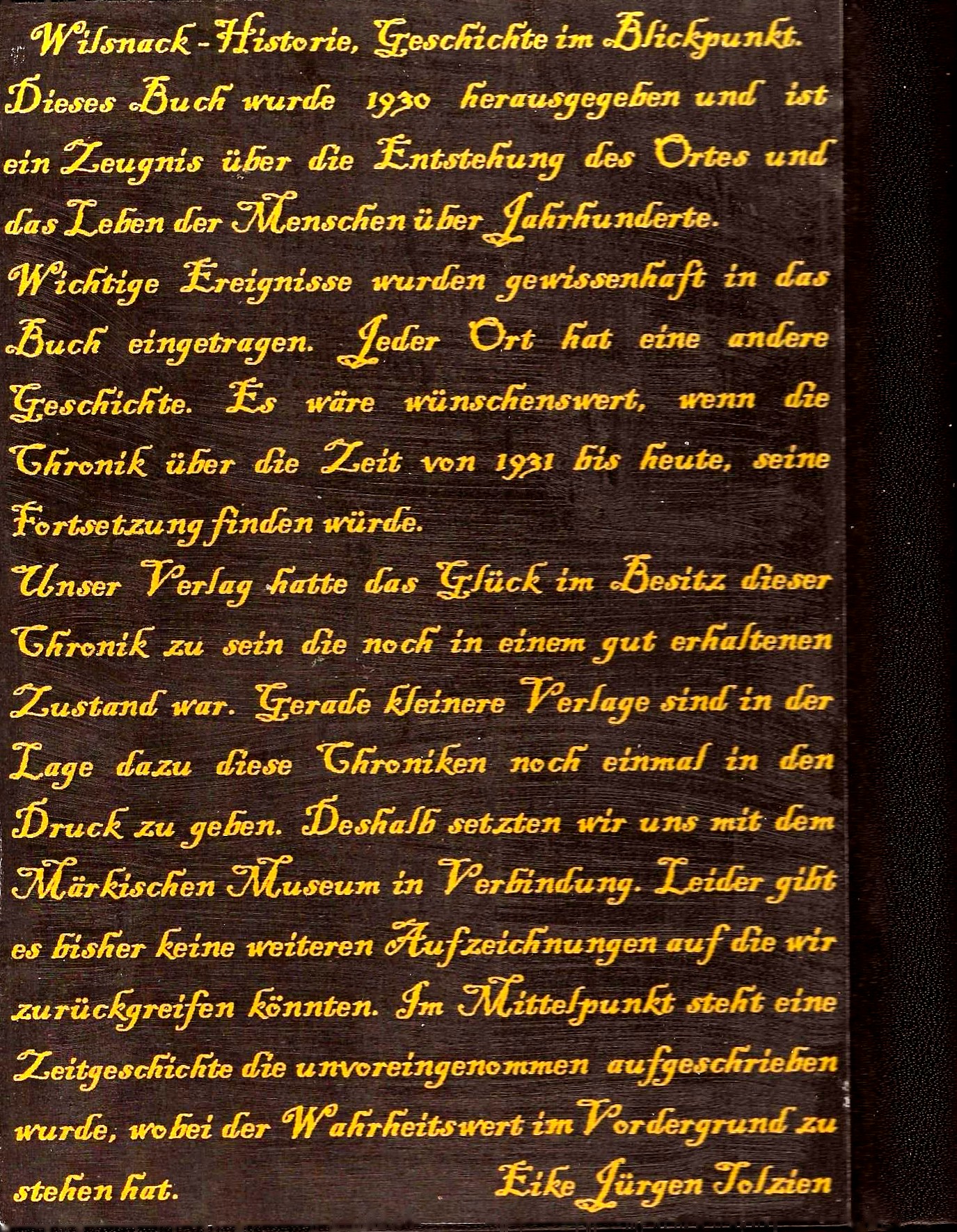 Unser Verlag hatte das Glück im Besitz dieser Chronik zu sein die noch in einem gut erhaltenen Zustand war. Gerade kleinere Verlage sind in der Lage dazu diese Chroniken noch einmal in den Druck zu geben. Deshalb setzten wir uns mit dem Märkischen Museum in Verbindung. Leider gibt es bisher keine weiteren Aufzeichnungen auf die wir zurückgreifen könnten. Im Mittelpunkt steht eine Zeitgeschichte die unvoreingenommen aufgeschrieben wurde, wobei der Wahrheitswert in Vordergrund zu stehen hat. Eike Jürgen Tolzien Auch als CD-ROM unter der ISBN 978-3-949904-54-7 bestellbar.