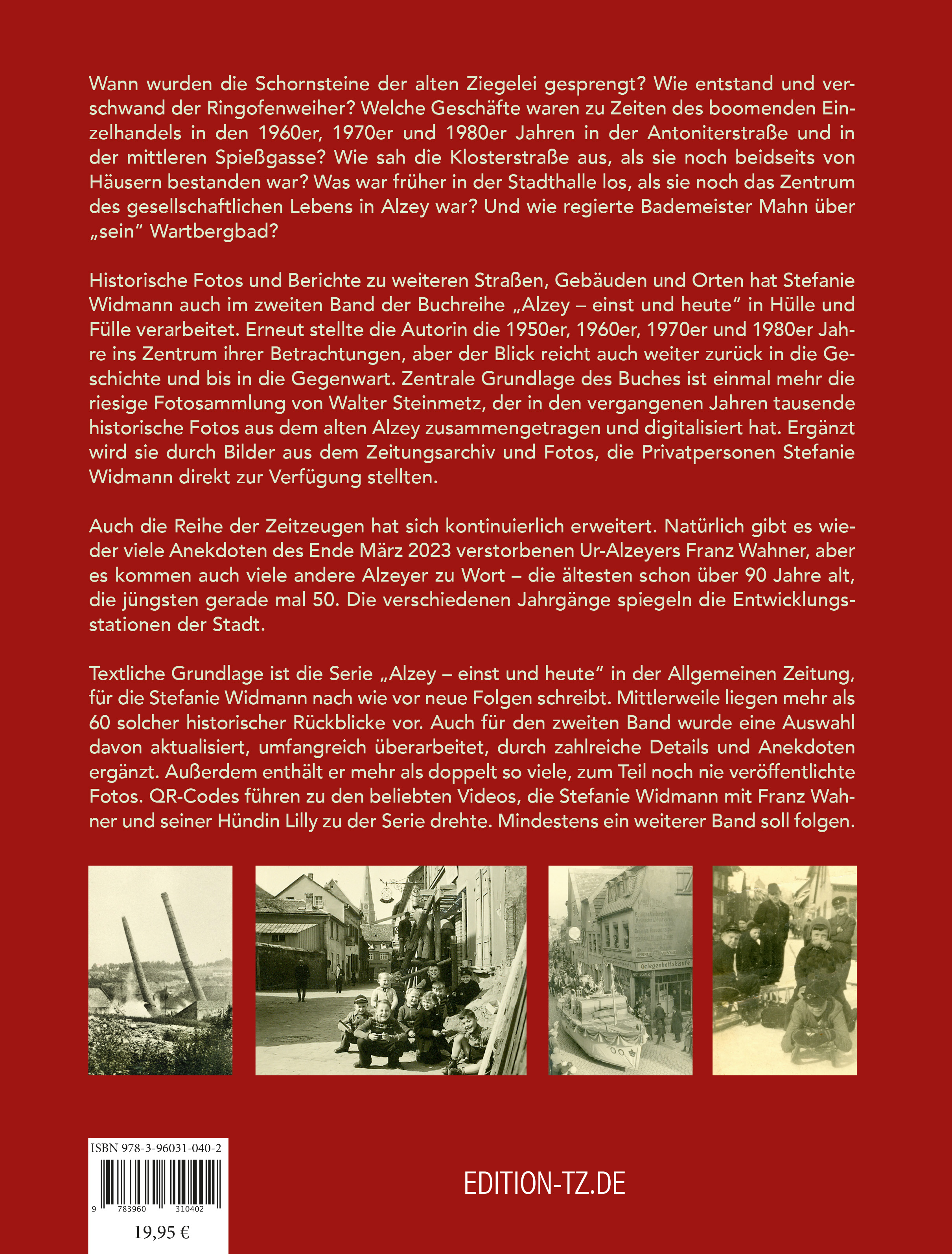 Wann wurden die Schornsteine der alten Ziegelei gesprengt? Wie entstand und verschwand der Ringofenweiher? Welche Geschäfte waren zu Zeiten des boomenden Einzelhandels in den 1960er, 1970er und 1980er Jahren in der Antoniterstraße und in der mittleren Spießgasse? Wie sah die Klosterstraße aus, als sie noch beidseits von Häusern bestanden war? Was war früher in der Stadthalle los, als sie noch das Zentrum des gesellschaftlichen Lebens in Alzey war? Und wie regierte der Bademeister Mahn über "sein" Wartbergbad? Historische Fotos und Berichte zu weiteren Straßen, Gebäuden und Orten hat Stefanie Widmann auch im zweiten Band der Buchreihe "Alzey - einst und heute" in Hülle und Fülle verarbeitet. Grundlage ist die Serie in der Allgemeinen Zeitung, für die Stefanie Widmann nach wie vor neue Folgen schreibt. Mittlerweile liegen mehr als 60 solcher historischer Rückblicke vor. Auch für den zweiten Band wurde eine Auswahl davon aktualisiert, umfangreich überarbeitet, durch zahlreiche Details und Anekdoten ergänzt. Mindestens ein weiterer Band soll folgen.