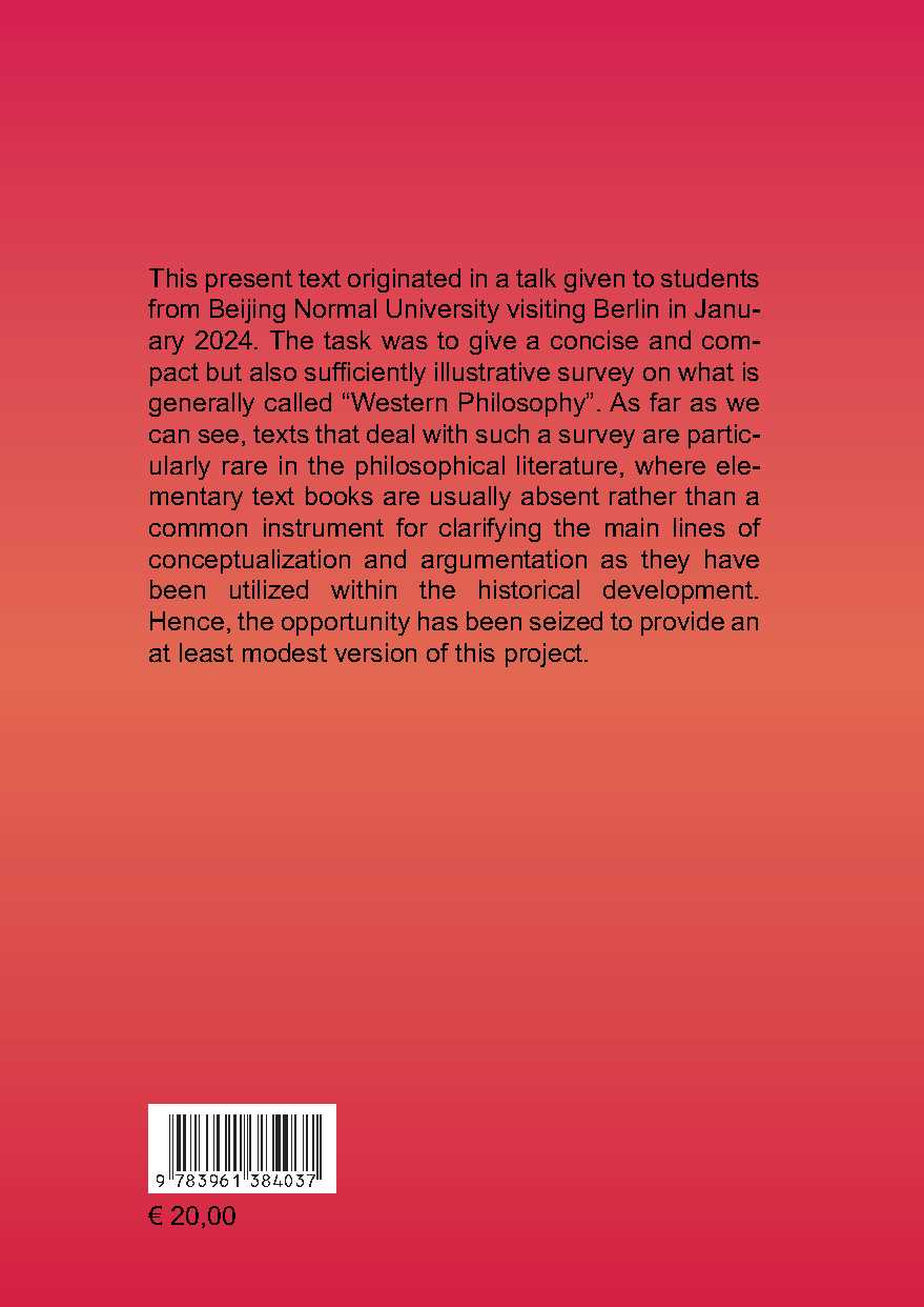 This present text originated in a talk given to students from Beijing Normal University visiting Berlin in January 2024. The task was to give a concise and compact but also sufficiently illustrative survey on what is generally called “Western Philosophy”. As far as we can see, texts that deal with such a survey are particularly rare in the philosophical literature, where elementary text books are usually absent rather than a common instrument for clarifying the main lines of conceptualization and argumentation as they have been utilized within the historical development. Hence, the opportunity has been seized to provide an at least modest version of this project.