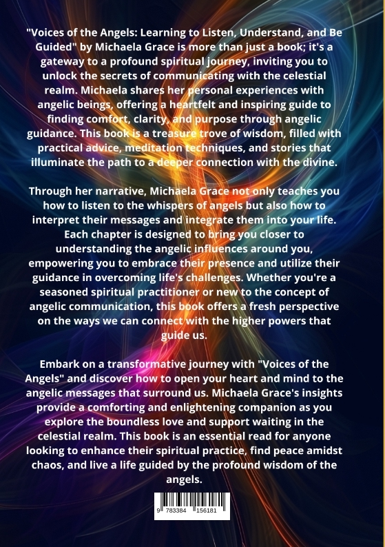 "Voices of the Angels: Learning to Listen, Understand, and Be Guided" by Michaela Grace is more than just a book; it's a gateway to a profound spiritual journey, inviting you to unlock the secrets of communicating with the celestial realm. Michaela shares her personal experiences with angelic beings, offering a heartfelt and inspiring guide to finding comfort, clarity, and purpose through angelic guidance. This book is a treasure trove of wisdom, filled with practical advice, meditation techniques, and stories that illuminate the path to a deeper connection with the divine.Through her narrative, Michaela Grace not only teaches you how to listen to the whispers of angels but also how to interpret their messages and integrate them into your life. Each chapter is designed to bring you closer to understanding the angelic influences around you, empowering you to embrace their presence and utilize their guidance in overcoming life's challenges. Whether you're a seasoned spiritual practitioner or new to the concept of angelic communication, this book offers a fresh perspective on the ways we can connect with the higher powers that guide us.Embark on a transformative journey with "Voices of the Angels" and discover how to open your heart and mind to the angelic messages that surround us. Michaela Grace's insights provide a comforting and enlightening companion as you explore the boundless love and support waiting in the celestial realm. This book is an essential read for anyone looking to enhance their spiritual practice, find peace amidst chaos, and live a life guided by the profound wisdom of the angels.