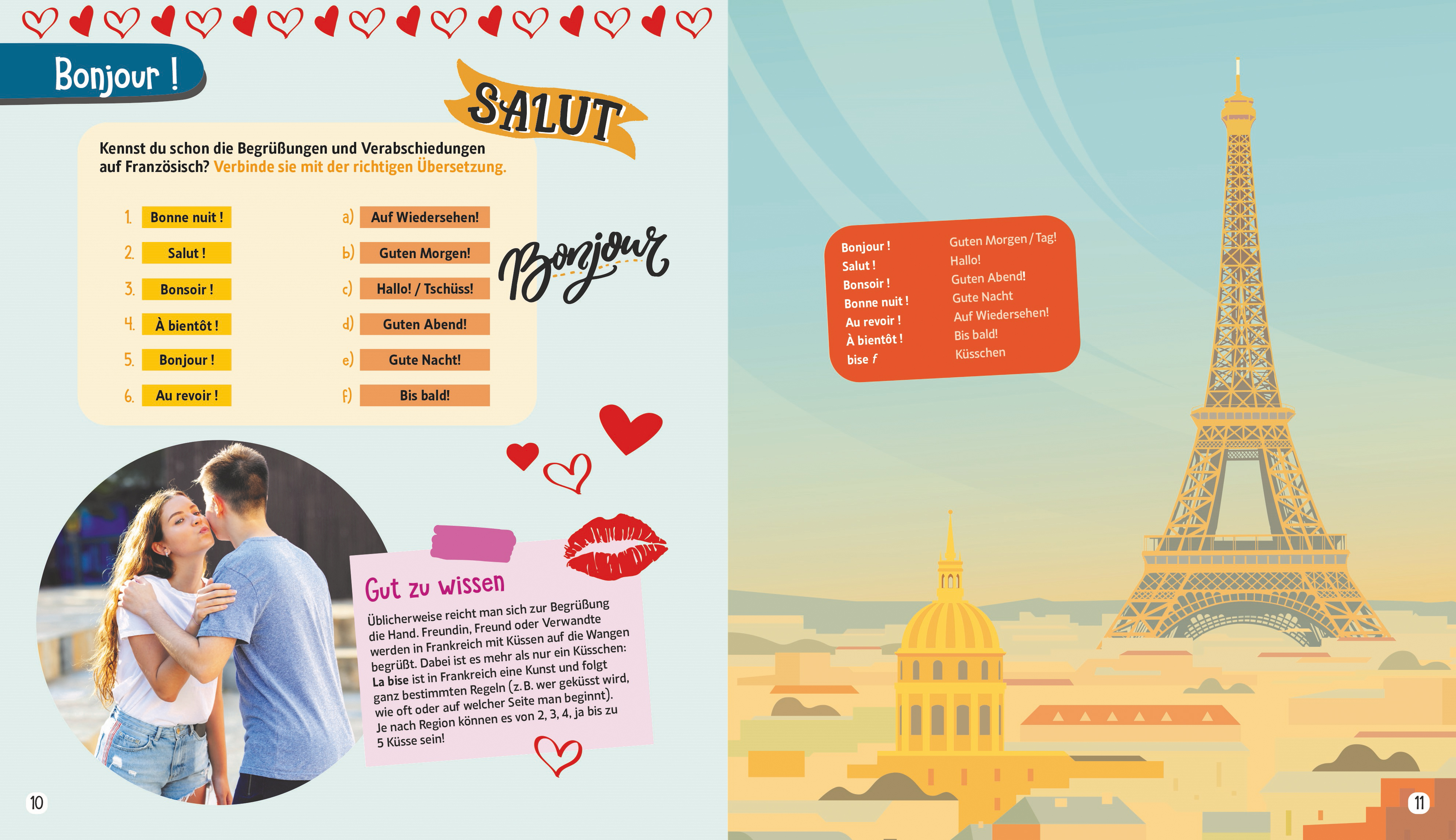 Unterhaltsame Inhalte wie beispielsweise das Rezept für den köstlichen Tarte Tatin, französischen Apfelkuchen, eine bunte Karte aller französischsprachigen Länder oder eine Anleitung zum Flirten in der Sprache der Liebe - der Spaß beim Französisch lernen steht hier im Vordergrund! Der aktuelle Trend von "Feel good" und "hygge" wird somit in den Sprachenbereich aufgenommen. Ergänzt durch Rätsel und zahlreiche Übungen, aber ohne Fokus auf lästige Grammatikregeln - ganz "facile". So wird eine Verbindung hergestellt zwischen Wohlfühlmomenten und Sprachenlernen!