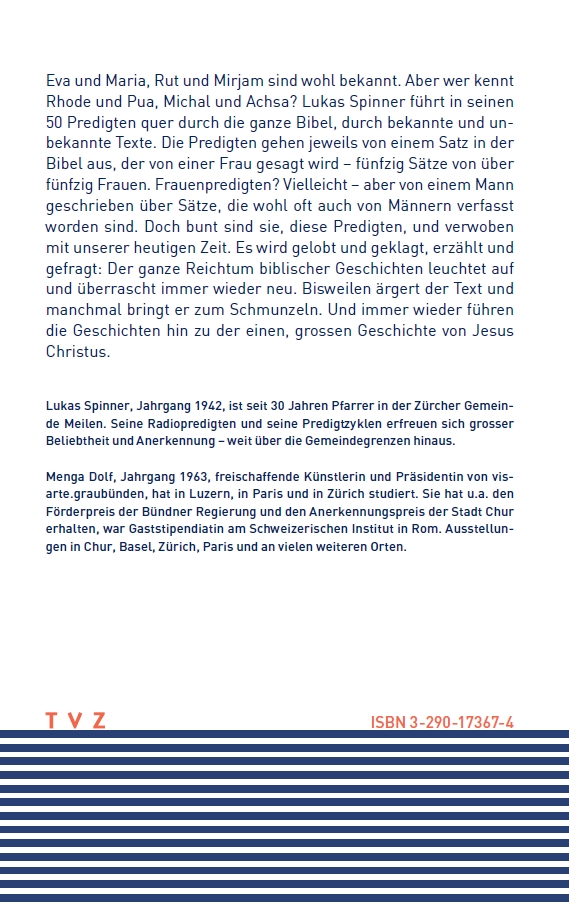 Eva und Maria, Rut und Mirjam sind wohlbekannt. Aber wer kennt Rhode und Pua, Michal und Achsa? Lukas Spinner führt in seinen 50 Predigten quer durch die ganze Bibel, durch bekannte und unbekannte Texte. Die Predigten gehen jeweils von einen Satz in der Bibel aus, der von einer Frau gesagt wird - 50 Sätze von über 50 Frauen. Frauenpredigten? Vielleicht - aber von einem Mann geschrieben über Sätze, die wohl oft auch von Männern verfasst worden sind. Doch bunt sind sie, diese Predigten und verwoben mit unserer heutigen Zeit. Es wird gelobt und geklagt, erzählt und gefragt: Der ganze Reichtum biblischer Geschichten kommt zum Leuchten und überrascht immer wieder neu. Bisweilen ärgert der Text und manchmal bringt er zum Schmunzeln. Und immer wieder führen die Geschichten hin zu der einen, grossen Geschichte von Jesus Christus. - Nach den 'Baumpredigten' und 'Wasserpredigten' erscheint damit Spinners dritter Predigtband. Die Predigten wurden in der reformierten Kirche Meilen in den Jahren 1999-2005 gehalten.