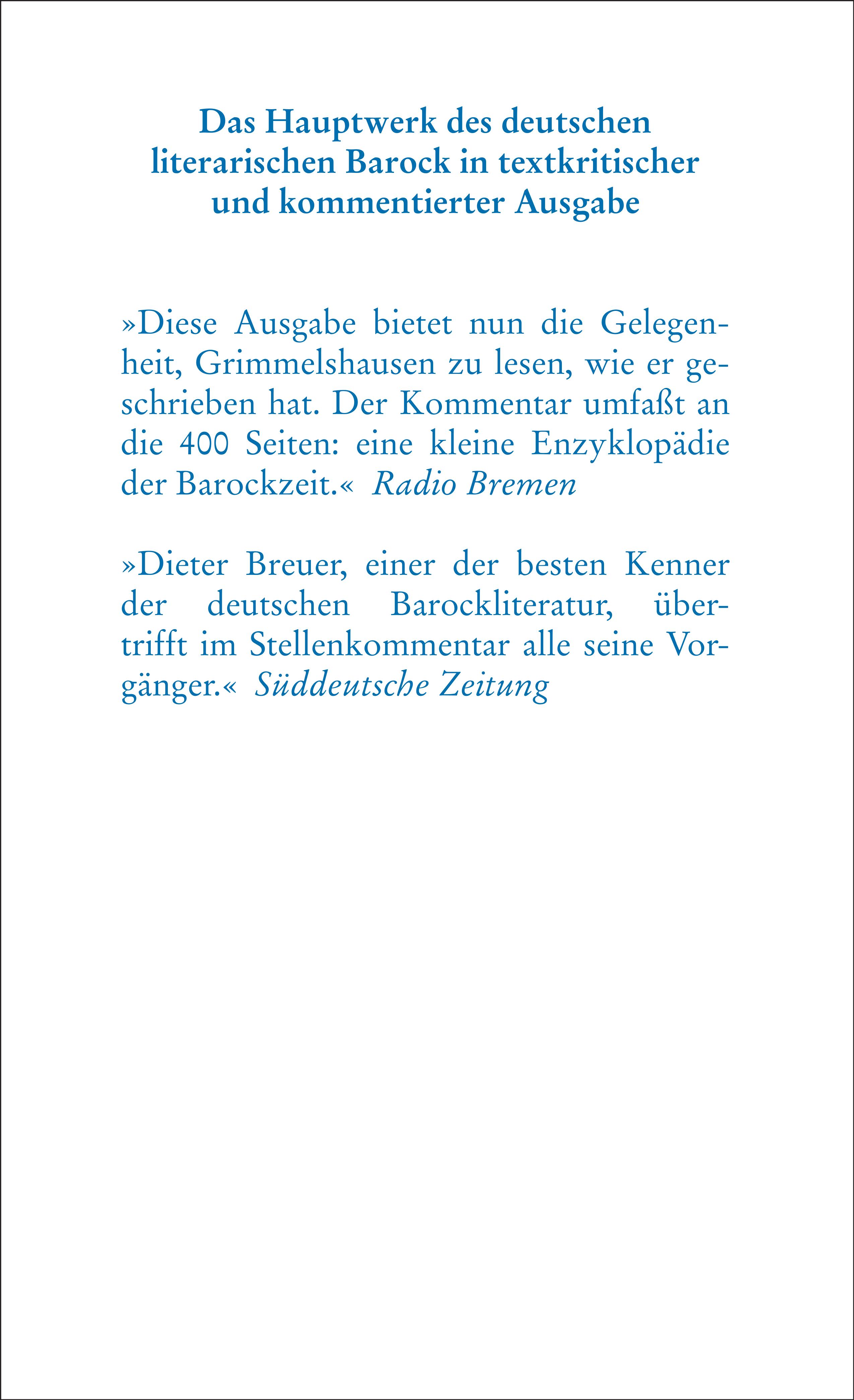 Diese Ausgabe bietet einen neuen kritischen Text des Simplicissimus Teutsch und der Continuatio, einen Text, der die von Grimmelshausen angestrebte provokative Monstrosität des Schreibens nicht mehr klassizistisch zu glätten sucht. Die neue Ausgabe enthält dazu die für das heutige Verständnis nötigen sprachlichen Erläuterungen und Kommentare.