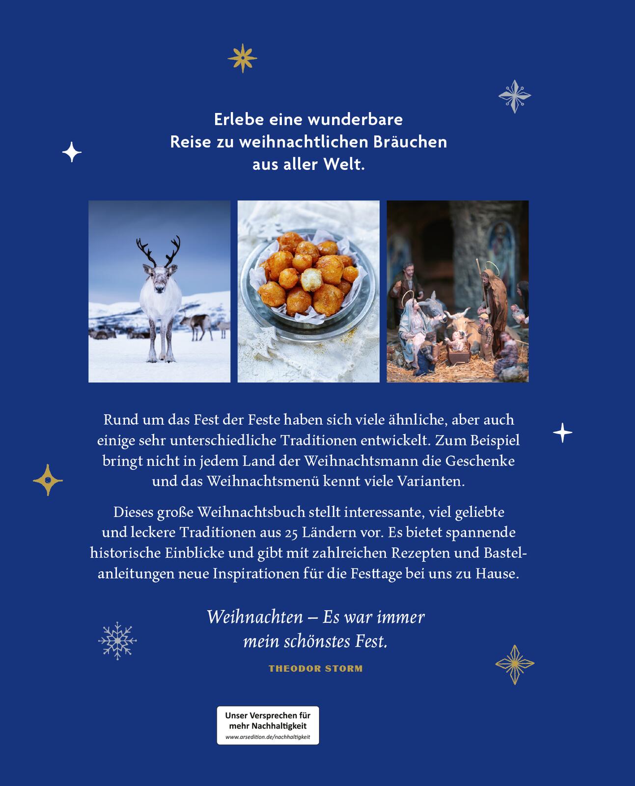 Wann und wie wird in anderen Ländern Weihnachten gefeiert? Wer bringt den Kindern anderswo die ersehnten Geschenke? Und was hat es eigentlich mit den Weihnachtsinseln auf sich? Das Fest zur Geburt Christi wird rund um die Welt mit unterschiedlichen Traditionen gefeiert - die interessantesten aus verschiedenen Ländern und von verschiedenen Kontinenten stellt dieses große Weihnachtsbuch vor. Es bietet einen spannenden Einblick in die historische Entwicklung des Fests und gibt mit zahlreichen liebevoll zusammengestellten Rezepten und Bastelanleitungen gleichzeitig Inspiration für die Gestaltung der Festtage bei uns zu Hause. So ist ein dickes Buch voller Winterzauber und Weihnachtsmagie für die ganze Familie entstanden.