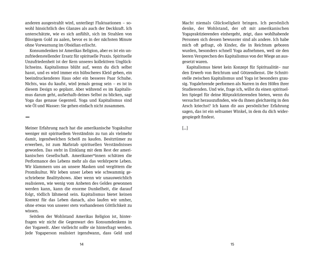 Scharfsinnig und ehrlich reflektiert Jessamyn Stanley ihre Geschichte: Sie erforscht sich selbst, vom Impostor-Syndrom über das Aufwachsen in einer streng gläubigen Familie und ihre Homosexualität bis hin zu der Frage, warum es ein Vollzeitjob ist, sich selbst zu lieben. Aber sie kritisiert auch eine oberflächliche, weiße Yogaindustrie, die lieber über die neuesten Styletrends diskutiert, als sich ihr überbordendes Weißsein einzugestehen. Eine Welt, in der Yoga mit Kapitalismus gleichgesetzt ist, die ihre eigenen Fehler (Stichwort: kulturelle Aneignung) und vor allem auch die (spirituellen) Traditionen des Yoga gekonnt ignoriert.
