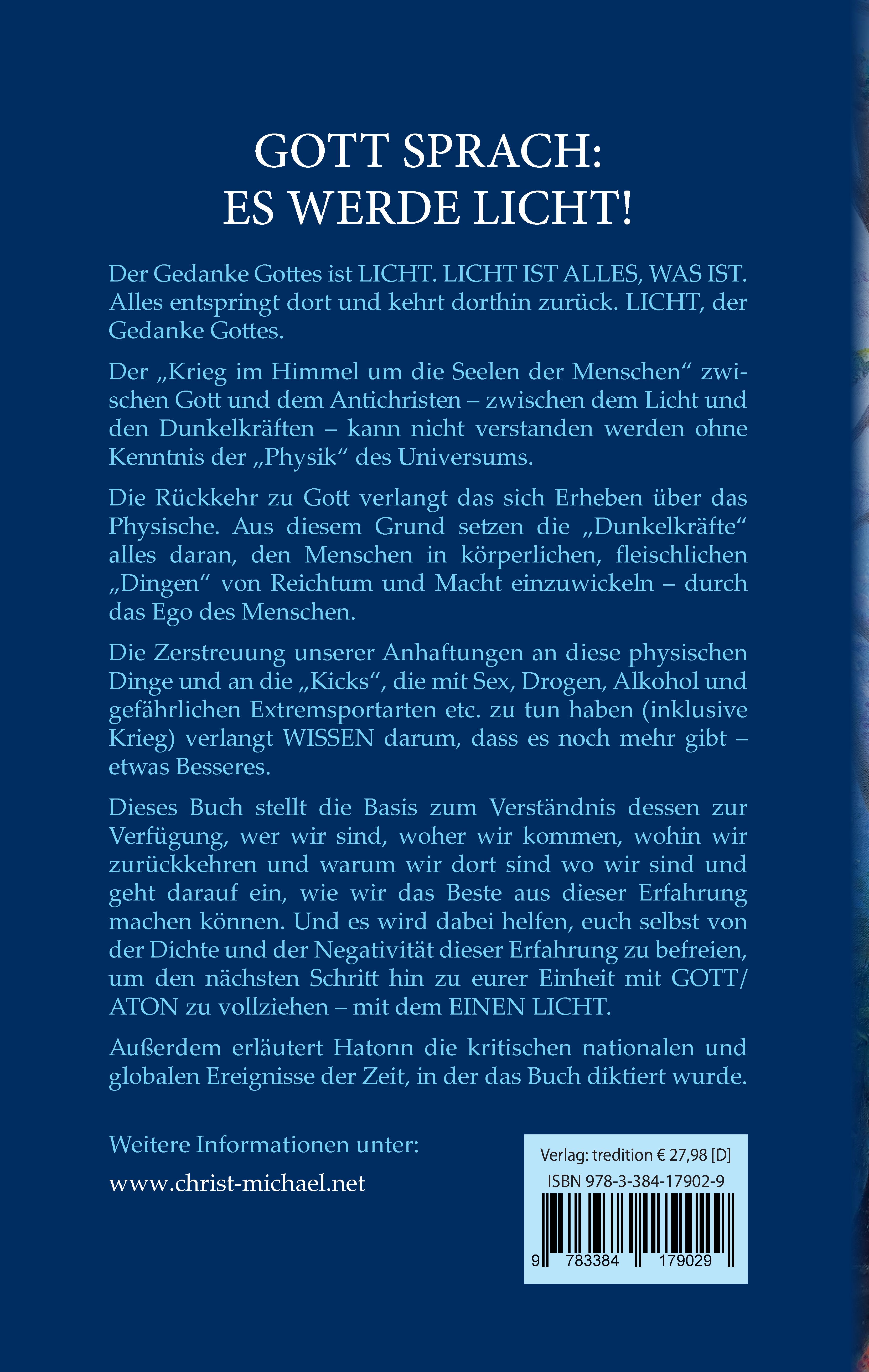 Im Titel des Buches heißt es "ES WERDE LICHT! UND DIE SCHÖPFUNG ENTSTAND". Tatsächlich ist es das LICHT, welches der Urgrund allen Seins ist. Warum das so ist, beschreibt Hatonn ausführlich. Im Licht ruht der Same der Schöpfung. "Im Licht liegt Sein und in der Saat der Wunsch zu sein. Und der Wunsch im Saatgut ist die Seele in der Saat," so Hatonn. "Ohne Licht vergehen alle Dinge. Selbst in den größten Tiefen der Ozeane, wo das Leben stillzustehen scheint - gibt es Leben, - und daher MUSS es dort Licht geben." Denn - so Hatonn weiter - "sämtliche Materie in diesem Universum ist nichts anderes als unterschiedlich konditionierte Bewegung, die Licht simuliert, und alle Unterschiede in der Beschaffenheit sind nur Druckunterschiede."Der Gedanke Gottes ist LICHT. LICHT IST ALLES, WAS IST. Alles entspringt dort und kehrt dorthin zurück. LICHT, der Gedanke Gottes.Der "Krieg im Himmel um die Seelen der Menschen" zwischen Gott und dem Antichristen - zwischen dem Licht und den Dunkelkräften - kann nicht verstanden werden ohne Kenntnis der "Physik" des Universums.Die Rückkehr zu Gott verlangt das sich Erheben über das Physische. Aus diesem Grund setzen die "Dunkelkräfte" alles daran, den Menschen in körperlichen, fleischlichen "Dingen" von Reichtum und Macht einzuwickeln - durch das Ego des Menschen.Die Zerstreuung unserer Anhaftungen an diese physischen Dinge und an die "Kicks", die mit Sex, Drogen, Alkohol und gefährlichen Extremsportarten etc. zu tun haben (inklusive Krieg) verlangt WISSEN darum, dass es noch mehr gibt - etwas Besseres. Dieses Buch stellt die Basis zum Verständnis dessen zur Verfügung, wer wir sind, woher wir kommen, wohin wir zurückkehren und warum wir dort sind wo wir sind und geht darauf ein, wie wir das Beste aus dieser Erfahrung machen können. Und es wird dabei helfen, euch selbst von der Dichte und der Negativität dieser Erfahrung zu befreien, um den nächsten Schritt hin zu eurer Einheit mit GOTT/ ATON zu vollziehen - mit dem EINEN LICHT.Denn unverzichtbar für die Rettung der Menschheit und unseres Planeten ist ein spiritueller Quantensprung, eine Befreiung unseres beschränkten Denkens und Wissens (welches uns zum Freiwild für satanische Eliten macht) hin zum erweiterten Bewusstsein um unsere innere Verbindung zu unserem Schöpfer. Deshalb gibt Hatonn neben den vielen Einblicken in die "Strickmuster" des Universums auch den Appell, dass wir die Illusionen unserer physischen Wahrnehmung transzendieren müssen. Denn unsere physischen Sinne betrügen uns. Materie ist nichts anderes als Bewegung und sie besitzt jenseits der Simulation von Realität keine echte Realität. Wir müssen die Augen und Ohren des Geistes öffnen, - so Hatonn - um das zu sehen und zu hören, was die physischen Augen und Ohren niemals sehen oder hören können, aber was ursächliche Wirklichkeit ist. Sind wir dazu endlich bereit und reif dafür? Außerdem erläutert Hatonn die kritischen nationalen und globalen Ereignisse der Zeit, in der das Buch diktiert wurde.