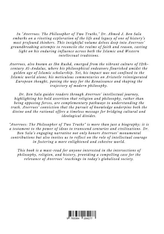 In "Averroes: The Philosopher of Two Truths," Dr. Ahmed J. Ben Sala embarks on a riveting exploration of the life and legacy of one of history's most profound thinkers. This insightful volume delves deep into Averroes' groundbreaking attempts to reconcile the realms of faith and reason, casting light on his enduring influence across both the Islamic and Western intellectual traditions.Averroes, also known as Ibn Rushd, emerged from the vibrant culture of 12th-century Al-Andalus, where his philosophical endeavors flourished amidst the golden age of Islamic scholarship. Yet, his impact was not confined to the Islamic world alone; his meticulous commentaries on Aristotle reinvigorated European thought, paving the way for the Renaissance and shaping the trajectory of modern philosophy.Dr. Ben Sala guides readers through Averroes' intellectual journey, highlighting his bold assertion that religion and philosophy, rather than being opposing forces, are complementary pathways to understanding the truth. Averroes' conviction that the pursuit of knowledge underpins both the divine and the rational offers a timeless message for bridging cultural and ideological divides."Averroes: The Philosopher of Two Truths" is more than just a biography; it is a testament to the power of ideas to transcend centuries and civilizations. Dr. Ben Sala's engaging narrative not only honors Averroes' monumental contributions but also invites us to reflect on the role of intellectual courage in fostering a more enlightened and cohesive world.This book is a must-read for anyone interested in the intersections of philosophy, religion, and history, providing a compelling case for the relevance of Averroes' teachings in today's globalized society.