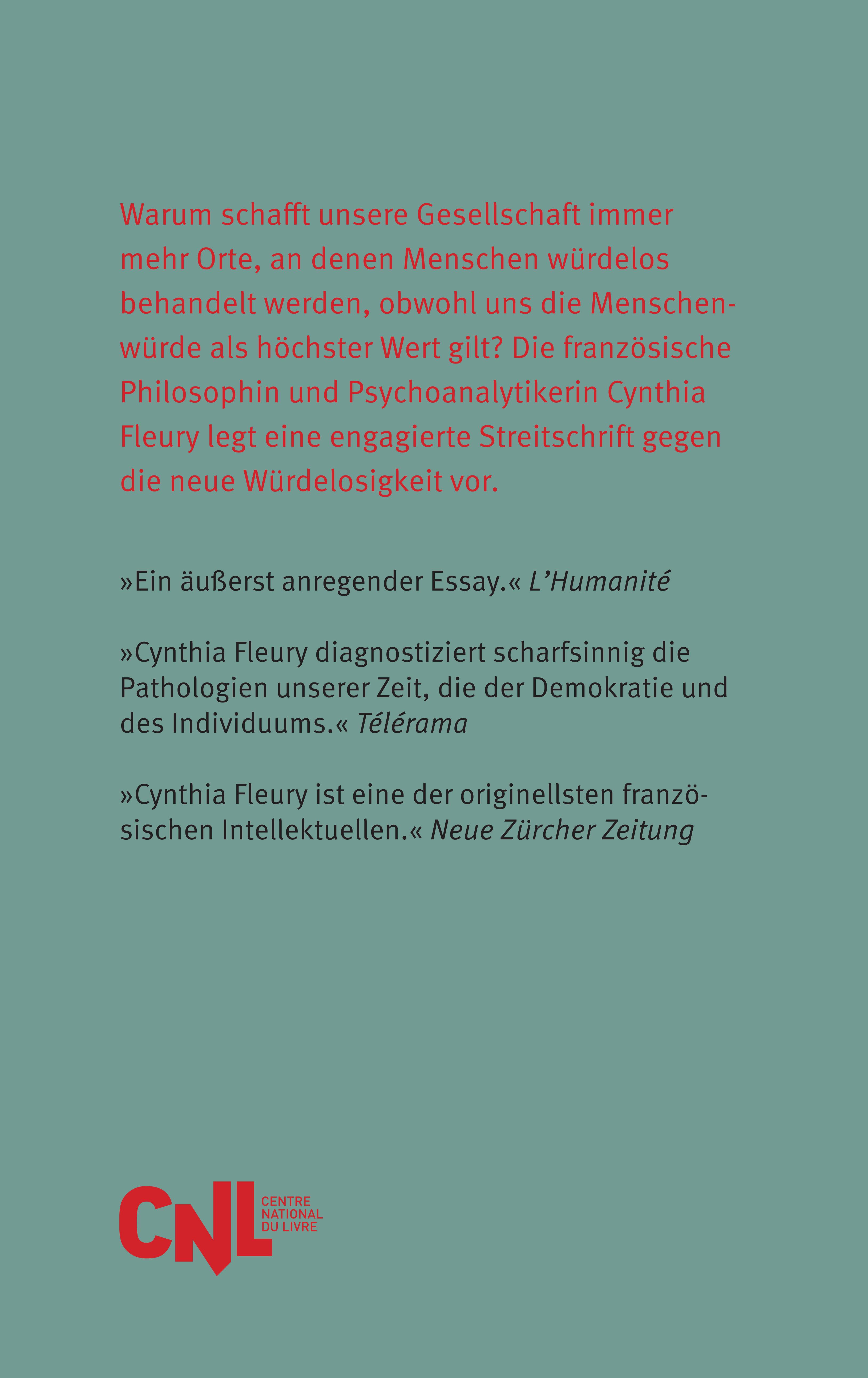 »Die Psychoanalytikerin und Philosophin Cynthia Fleury ruft dazu auf, die Würde neu zu begründen, und beklagt die tragische Diskrepanz zwischen der Behauptung einer universellen Menschenwürde und der Realität, die diese widerlegt.« Le Monde