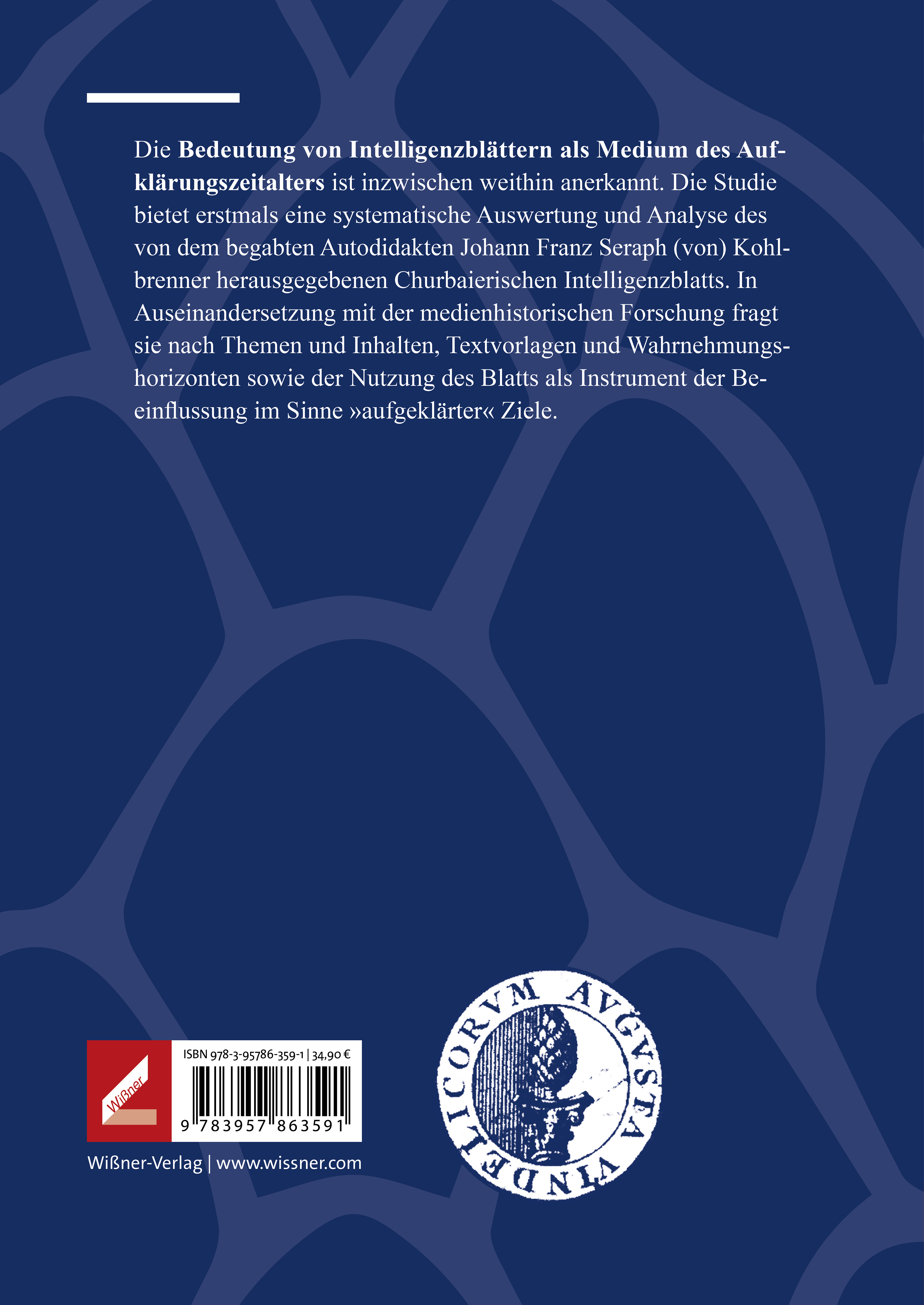 Die Bedeutung von Intelligenzblättern als Medium des Aufklärungszeitalters ist inzwischen weithin anerkannt. Die Studie bietet erstmals eine systematische Auswertung und Analyse des von dem begabten Autodidakten Johann Franz Seraph (von) Kohlbrenner herausgegebenen Churbaierischen Intelligenzblatts. In Auseinandersetzung mit der medienhistorischen Forschung fragt sie nach Themen und Inhalten, Textvorlagen und Wahrnehmungshorizonten sowie der Nutzung des Blatts als Instrument der Beeinflussung im Sinne »aufgeklärter« Ziele.