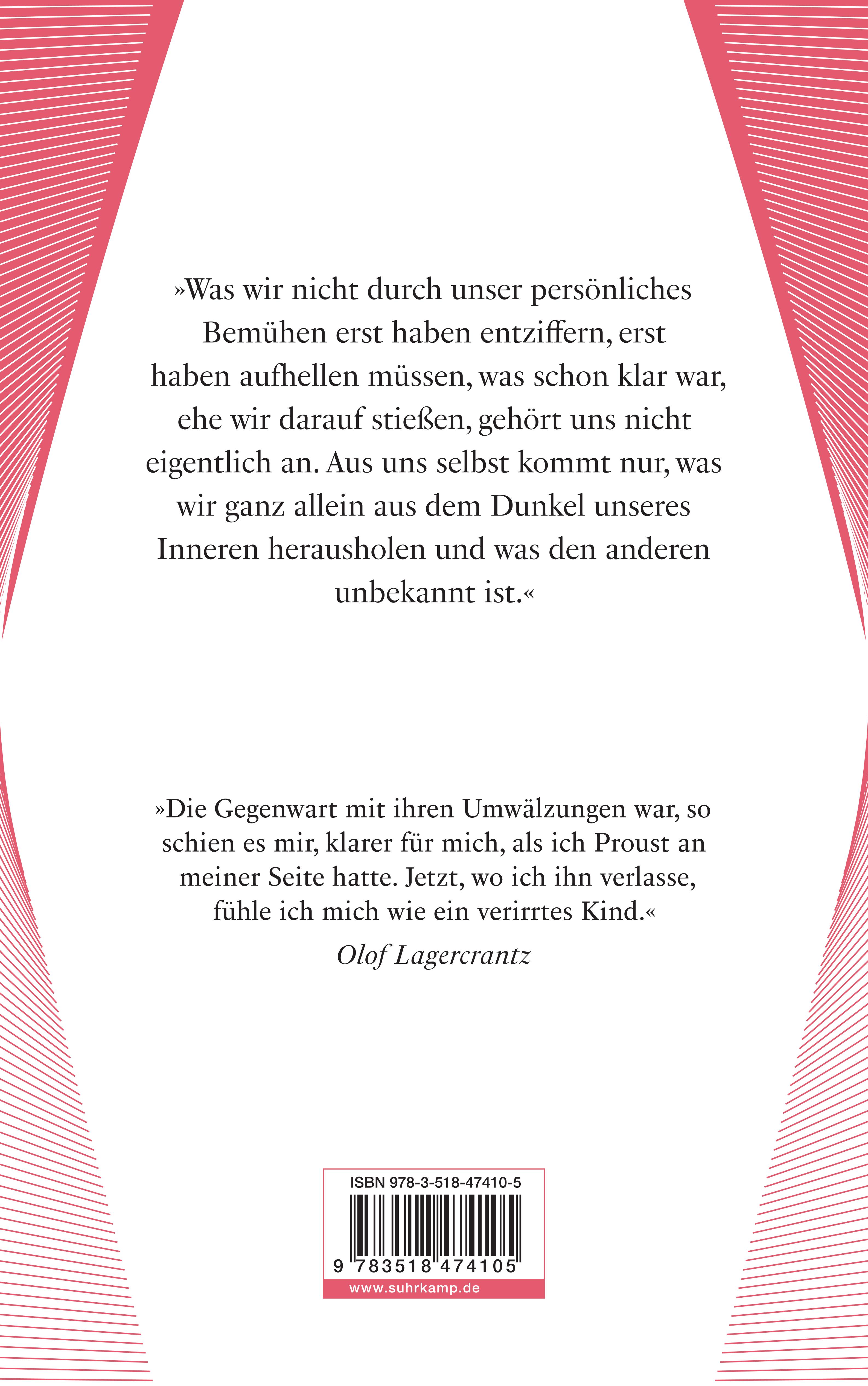 Marcel Proust wurde am 10. Juli 1871 in Auteuil geboren und starb am 18. November 1922 in Paris. Sein siebenbändiges Romanwerk Auf der Suche nach der verlorenen Zeit ist zu einem Mythos der Moderne geworden. Eine Asthmaerkrankung beeinträchtigte schon früh Prousts Gesundheit. Noch während des Studiums und einer kurzen Tätigkeit an der Bibliothek Mazarine widmete er sich seinen schriftstellerischen Arbeiten und einem – nur vermeintlich müßigen – Salonleben. Es erschienen Beiträge für Zeitschriften und die Übersetzungen zweier Bücher von John Ruskin. Nach dem Tod der über alles geliebten Mutter 1905, der ihn in eine tiefe Krise stürzte, machte Proust die Arbeit an seinem Roman zum einzigen Inhalt seiner Existenz. Sein hermetisch abgeschlossenes, mit Korkplatten ausgelegtes Arbeits- und Schlafzimmer ist legendär. In Swanns Welt, der erste Band von Prousts opus magnum, erschien 1913 auf Kosten des Autors im Verlag Grasset. Für den zweiten Band, Im Schatten junger Mädchenblüte, wurde Proust 1919 mit dem Prix Goncourt ausgezeichnet. Die letzten Bände der Suche nach der verlorenen Zeit wurden nach dem Tod des Autors von seinem Bruder herausgegeben.