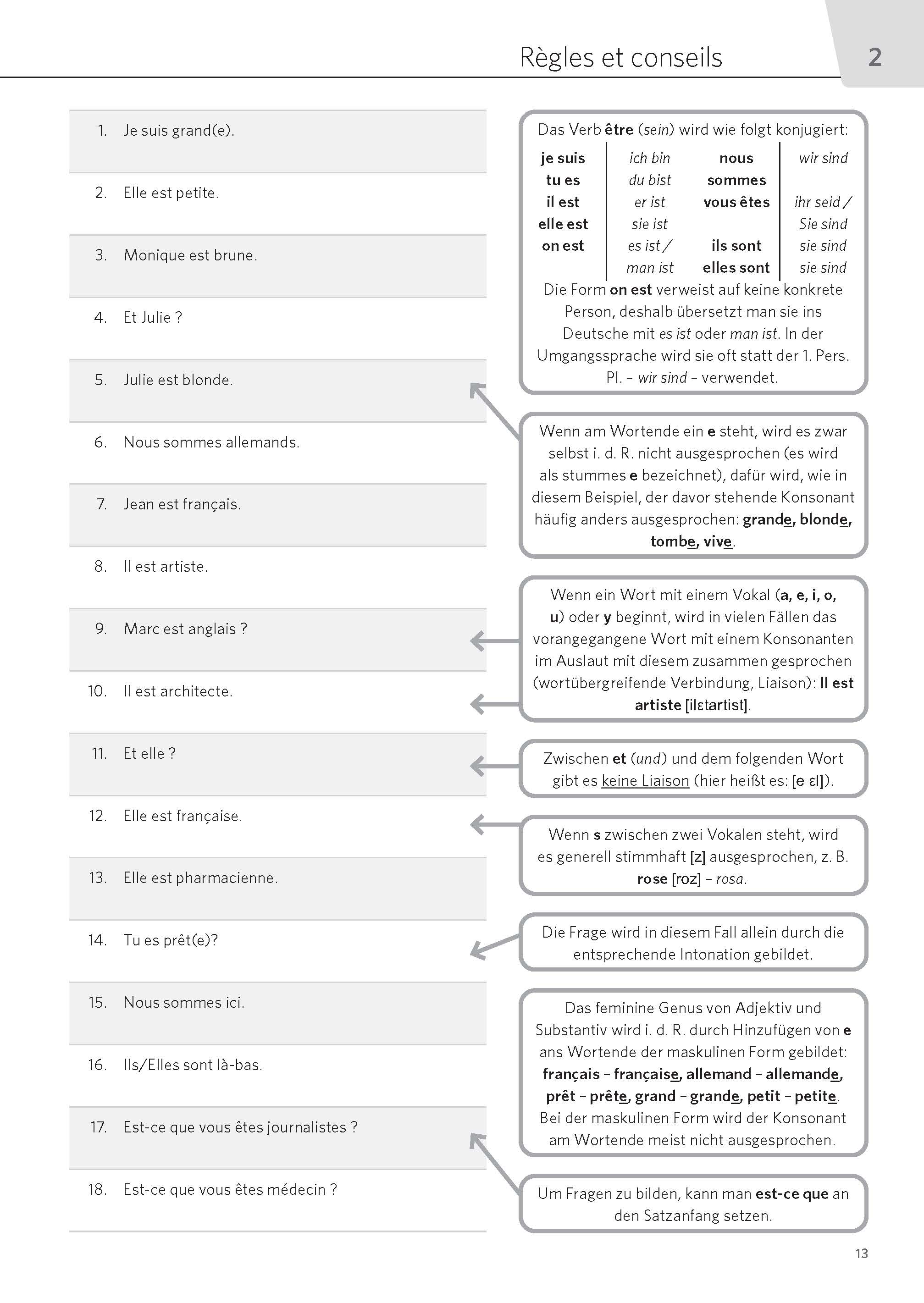- Grammatik der Stufe A1 wird in überschaubaren Portionen erklärt, z.B. die Verben être, avoir und andere unregelmäßige Verben, Teilungsartikel, Fragesätze, die Konstruktion il y a und vieles mehr