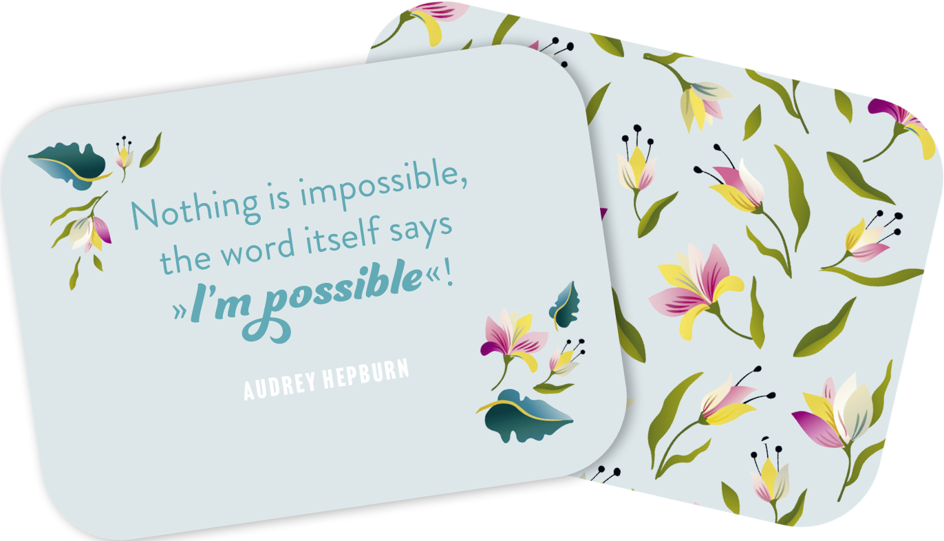Frauen sind einfach wunderbar! Und diese 25 kleinen Affirmationskarten erinnern auf besonders charmante Art daran. Jede Selbstliebe-Karte liefert einen motivierenden Spruch, ein kraftvolles Motto oder ein kluges Zitat einer bekannten Persönlichkeit, die Frauen Mut zusprechen und unterstützen.