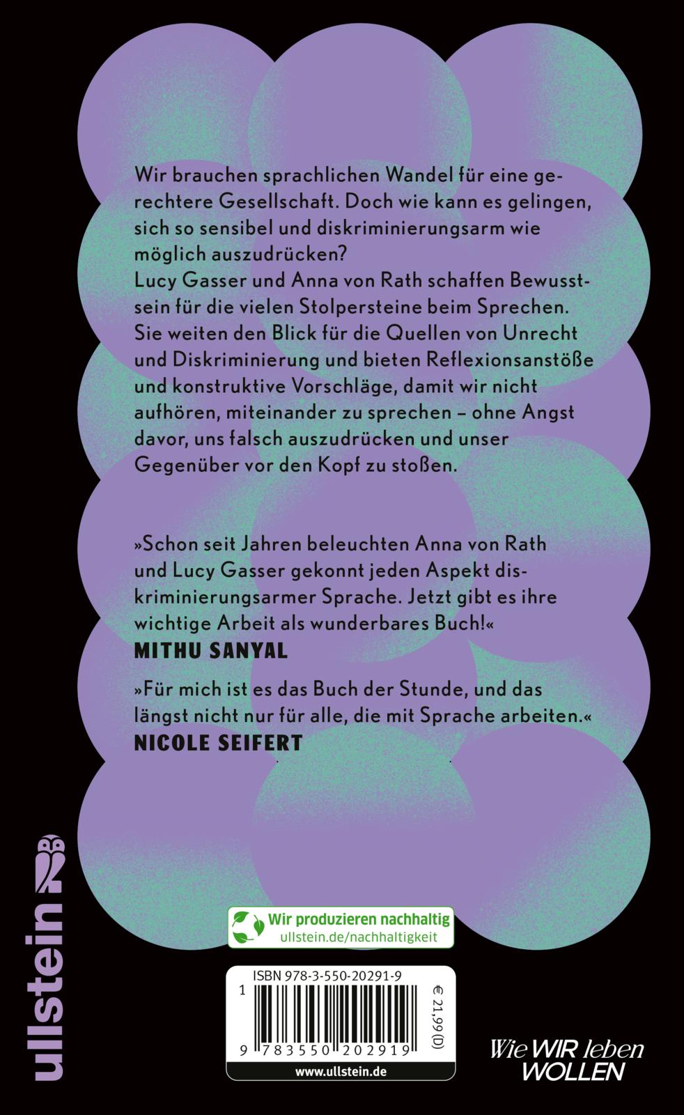 »Schon seit Jahren beleuchten Anna von Rath und Lucy Gasser gekonnt jeden Aspekt diskriminierungsarmer Sprache. Jetzt gibt es ihre wichtige Arbeit als wunderbares Buch!« Mithu Sanyal