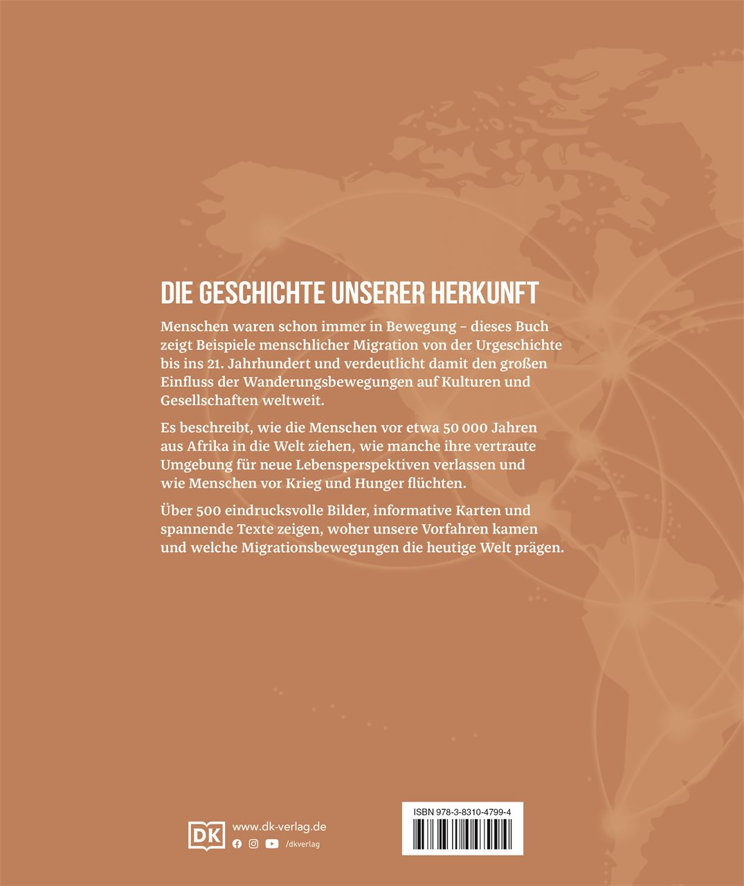 Mit eindrucksvollen Fotos, Illustrationen und Berichten aus erster Hand veranschaulicht dieses innovative Geschichtsbuch die Bewegungen von Menschen und Kulturen auf der ganzen Welt – von den frühen Wanderungen des Homo erectus aus Afrika vor 50.000 Jahren bis hin zu aktuellen Flüchtlingsbewegungen – und weitet so den Blick auf die Herausforderungen unserer Zeit. Jede Doppelseite widmet sich einem spezifischen geschichtlichen Migrations-Ereignis oder übergreifenden Migrationsursachen wie Flucht, Überbevölkerung, Krieg, Nahrungsmangel, Klimawandel oder Binnenmigration.