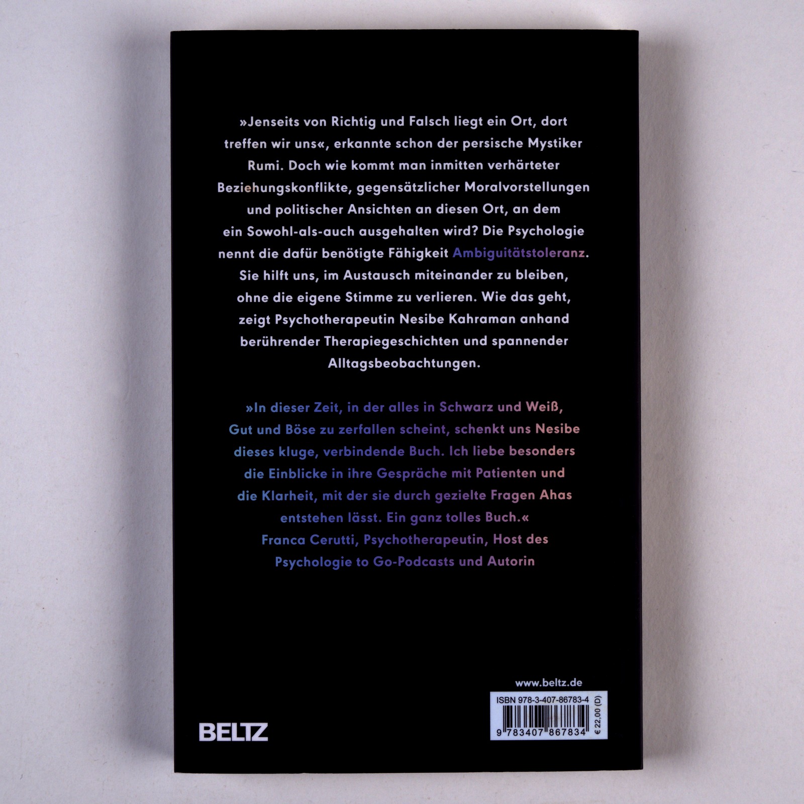 »In dieser Zeit, in der alles in Schwarz und Weiß, Gut und Böse zu zerfallen scheint, schenkt uns Nesibe dieses kluge, verbindende Buch. In einfühlsamer Sprache ermuntert sie uns, Ambiguität zu ertragen, den Zwiespalt zu akzeptieren und die Zwischenräume zu füllen. Ich liebe besonders die Einblicke in Nesibes Gespräche mit Patienten und die Klarheit, in der sie durch gezielte Fragen Ahas entstehen lässt. Ein ganz tolles Buch.« Franca Cerutti, Psychotherapeutin, Host des Psychologie to Go-Podcasts und Autorin