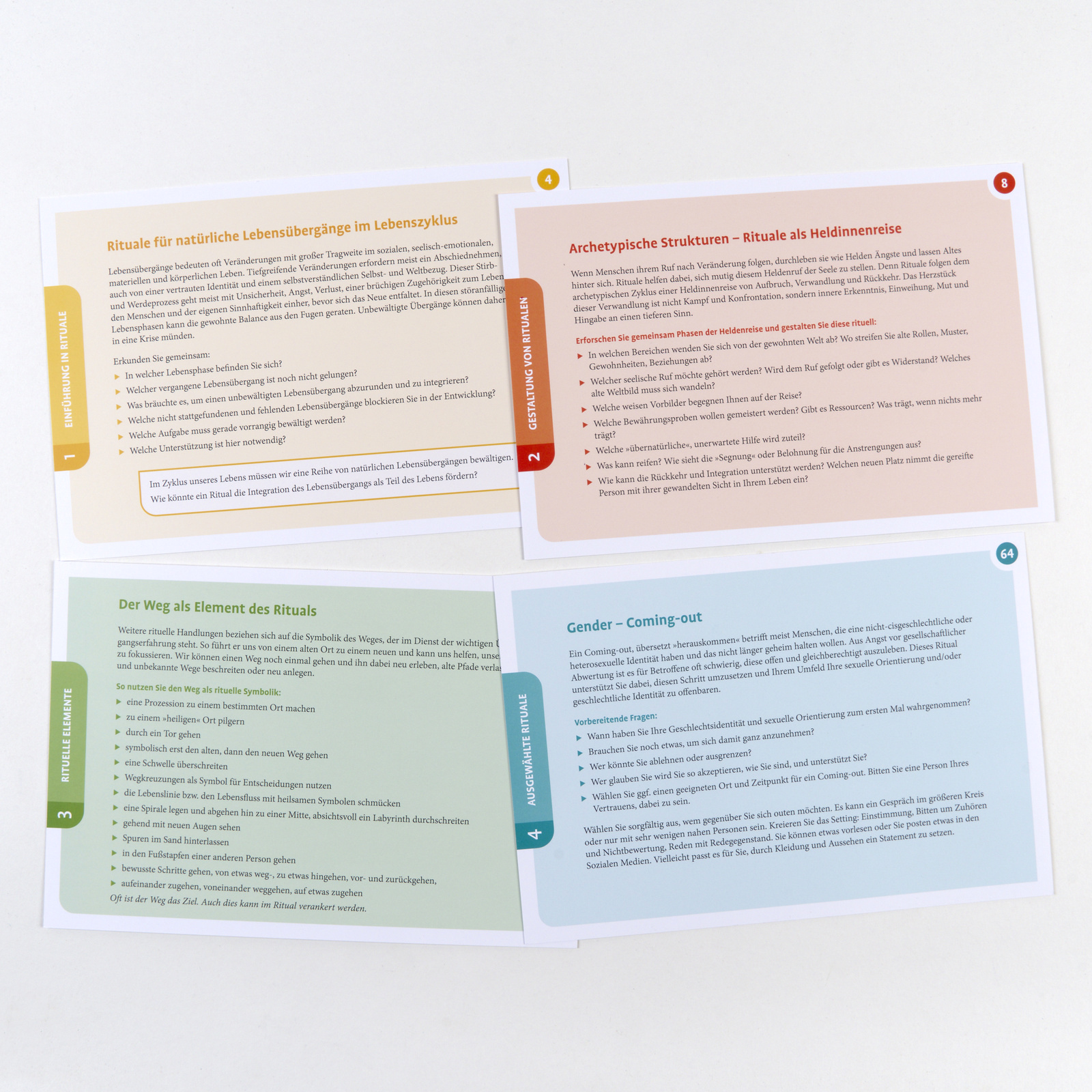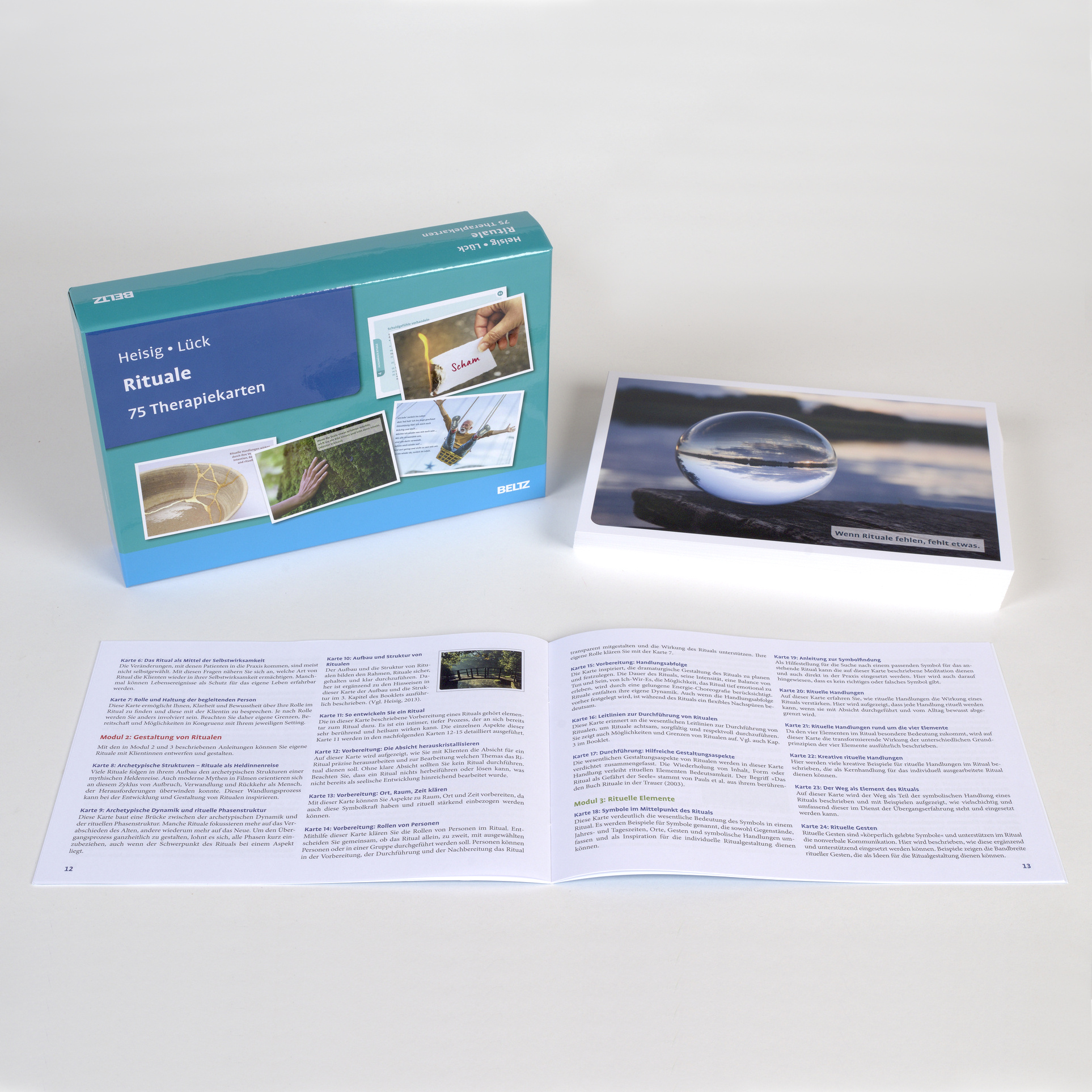 Das Kartenset zeigt den Einsatz von Ritualen in Therapie und Beratung: Wie kann die Vergangenheit gewürdigt und neue Ausrichtungen bewusst gestaltet werden? Dabei stellt es für verschiedene Lebensphasen und Lebensthemen viele kreative Rituale bereit, lädt aber auch dazu ein, gemeinsam mit den Patient:innen neue, individuell passende Rituale zu entwickeln.