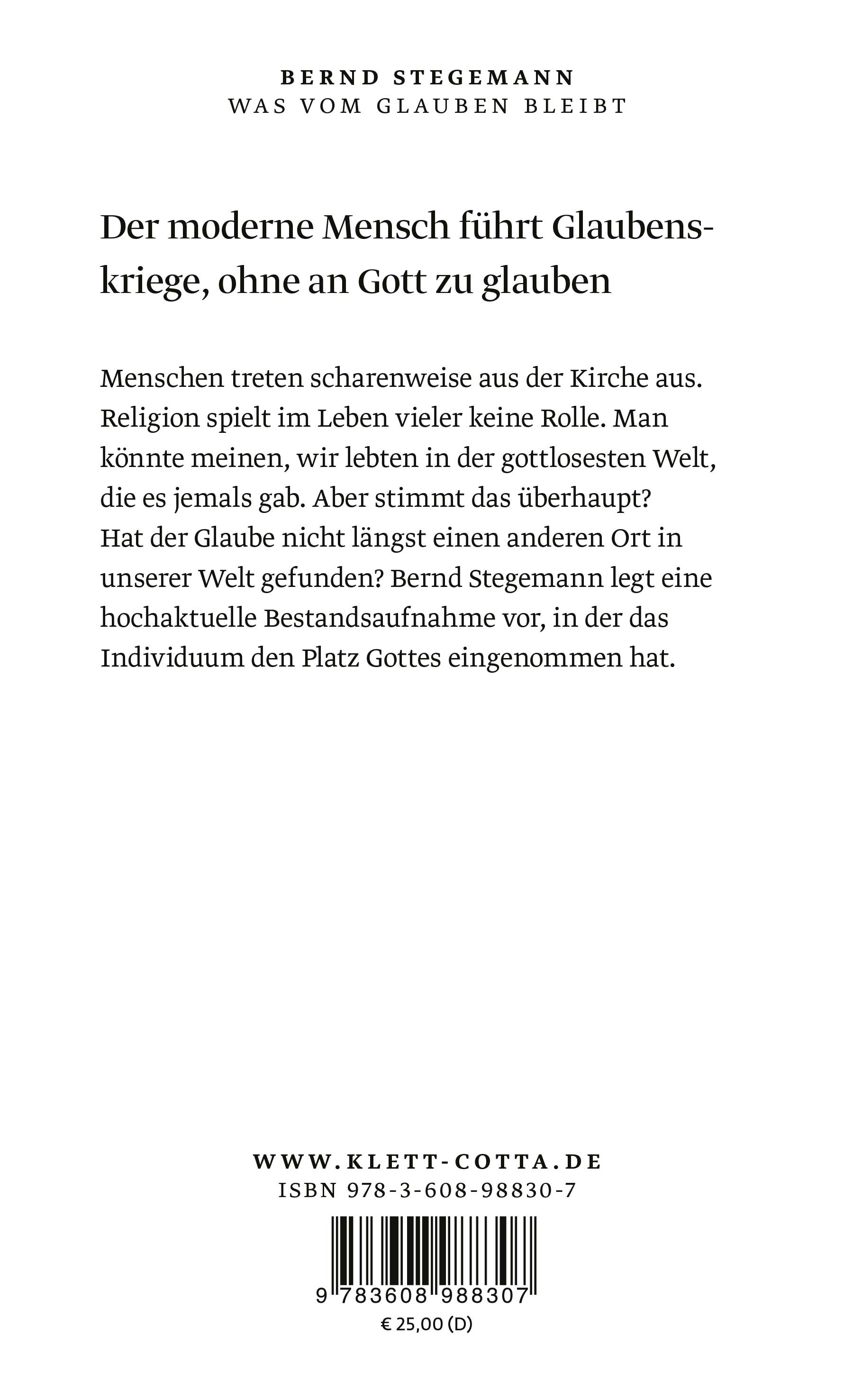 Menschen treten scharenweise aus der Kirche aus. Religion spielt im Leben vieler keine Rolle. Man könnte meinen, wir lebten in der gottlosesten Welt, die es jemals gab. Aber stimmt das überhaupt? Hat der Glaube nicht längst einen anderen Ort in unserer Welt gefunden? Bernd Stegemann legt eine hochaktuelle Bestandsaufnahme der Welt vor, in der das Individuum den Platz Gottes eingenommen hat.