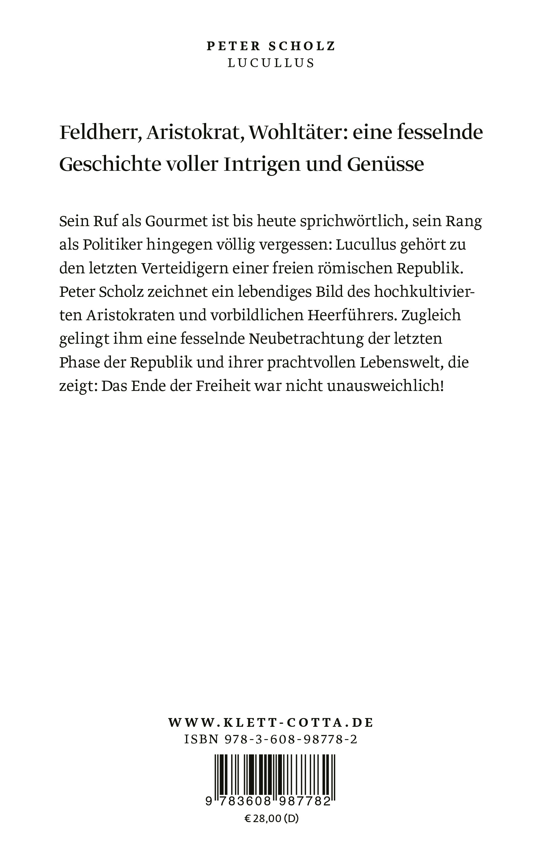 Sein Ruf als Gourmet ist bis heute sprichwörtlich, sein Rang als Politiker hingegen völlig vergessen: Lucullus gehört zu den letzten Verteidigern einer freien römischen Republik. Peter Scholz zeichnet ein lebendiges Bild des hochkultivierten Aristokraten und vorbildlichen Heerführers. Zugleich gelingt ihm eine fesselnde Neubetrachtung der letzten Phase der Republik und ihrer prachtvollen Lebenswelt, die zeigt: Das Ende der Freiheit war nicht unausweichlich!