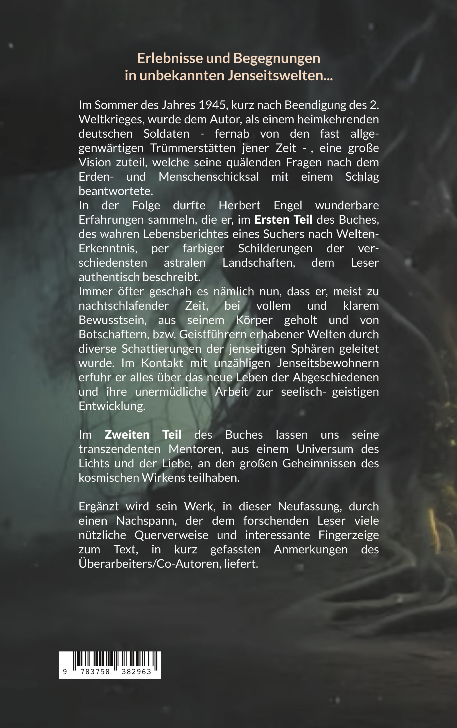 Erlebnisse und Begegnungen in unbekannten Jenseitswelten... Im Sommer des Jahres 1945, kurz nach Beendigung des 2. Weltkrieges, wurde dem Autor, als einem heimkehrenden deutschen Soldaten - fernab von den fast allgegenwärtigen Trümmerstätten jener Zeit -, eine große Vision zuteil, welche seine quälenden Fragen nach dem Erden- und Menschenschicksal mit einem Schlag beantwortete. In der Folge durfte Herbert Engel wunderbare Erfahrungen sammeln, die er, im Ersten Teil des Buches, des wahren Lebensberichtes eines Suchers nach Welten-Erkenntnis, per farbiger Schilderungen der verschiedensten astralen Landschaften, dem Leser authentisch beschreibt. Immer öfter geschah es nämlich nun, dass er, meist zu nachtschlafender Zeit, bei vollem und klarem Bewusstsein, aus seinem Körper geholt und von Botschaftern, bzw. Geistführern erhabener Welten durch diverse Schattierungen der jenseitigen Sphären geleitet wurde. Im Kontakt mit unzähligen Jenseitsbewohnern erfuhr er alles über das neue Leben der Abgeschiedenen und ihre unermüdliche Arbeit zur seelisch-geistigen Entwicklung. Im Zweiten Teil des Buches lassen uns seine transzendenten Mentoren, aus einem Universum des Lichts und der Liebe, an den großen Geheimnissen des kosmischen Wirkens teilhaben. Ergänzt wird sein Werk, in dieser Neufassung, durch einen Nachspann, der dem forschenden Leser viele nützliche Querverweise und interessante Fingerzeige zum Text, in kurz gefassten Anmerkungen des Überarbeiters/Co-Autoren, liefert.