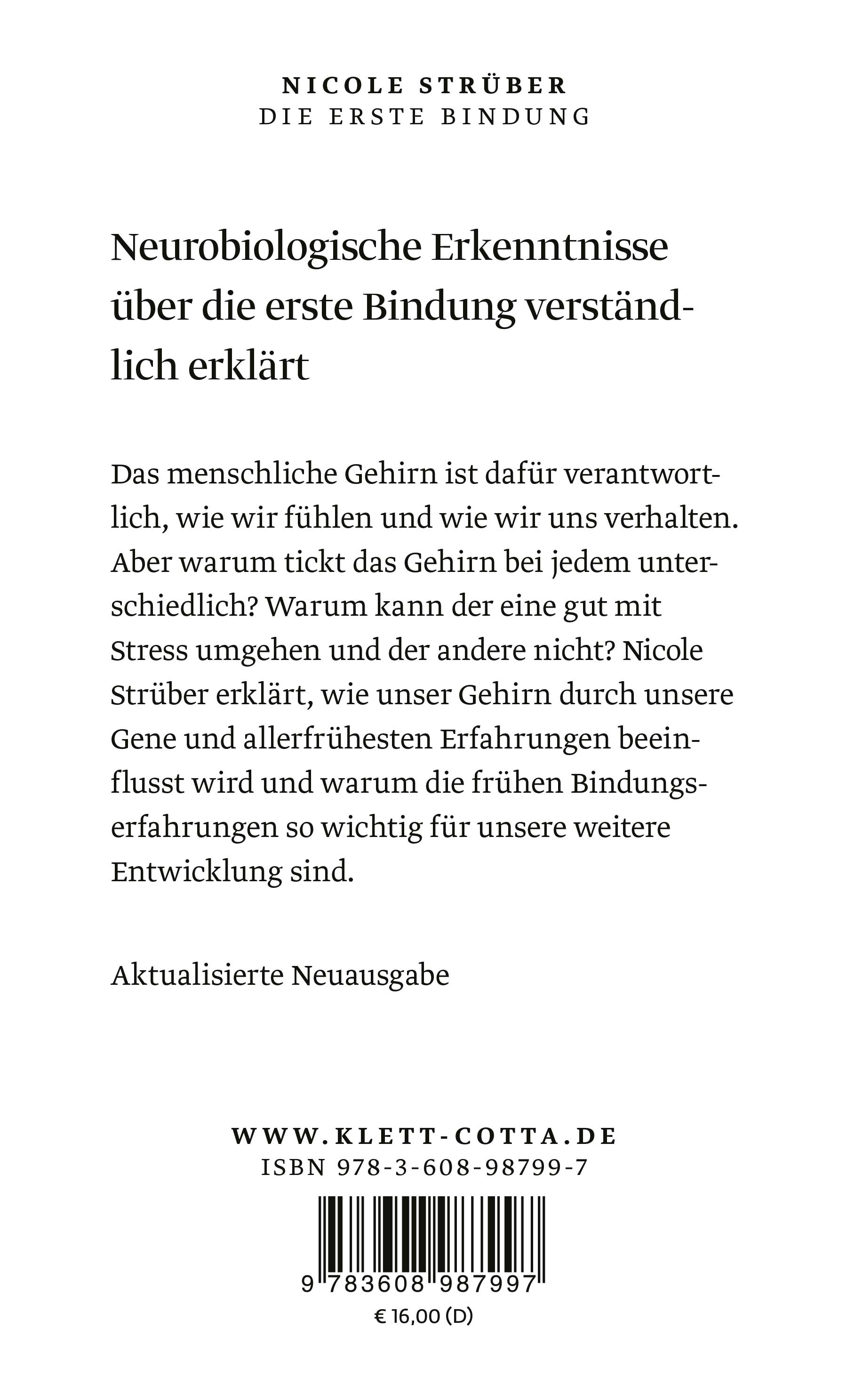 | Schlagworte | Baby • Bindung • Bindungsbeziehung • Eltern • Eltern-Kind-Bindung • Entwicklung • erste Lebensjahre • Gehirn • Hirnforschung • Kinder • Kinderbetreuung • Kita • Kita-Betreuung • Kleinkind • Mutter-Kind-Bindung • Neurobiologie • Neurowissenschaften • Persönlichkeitsentwicklung • Psychologie • Säugling • Säuglinge • Soziale Kompetenz |