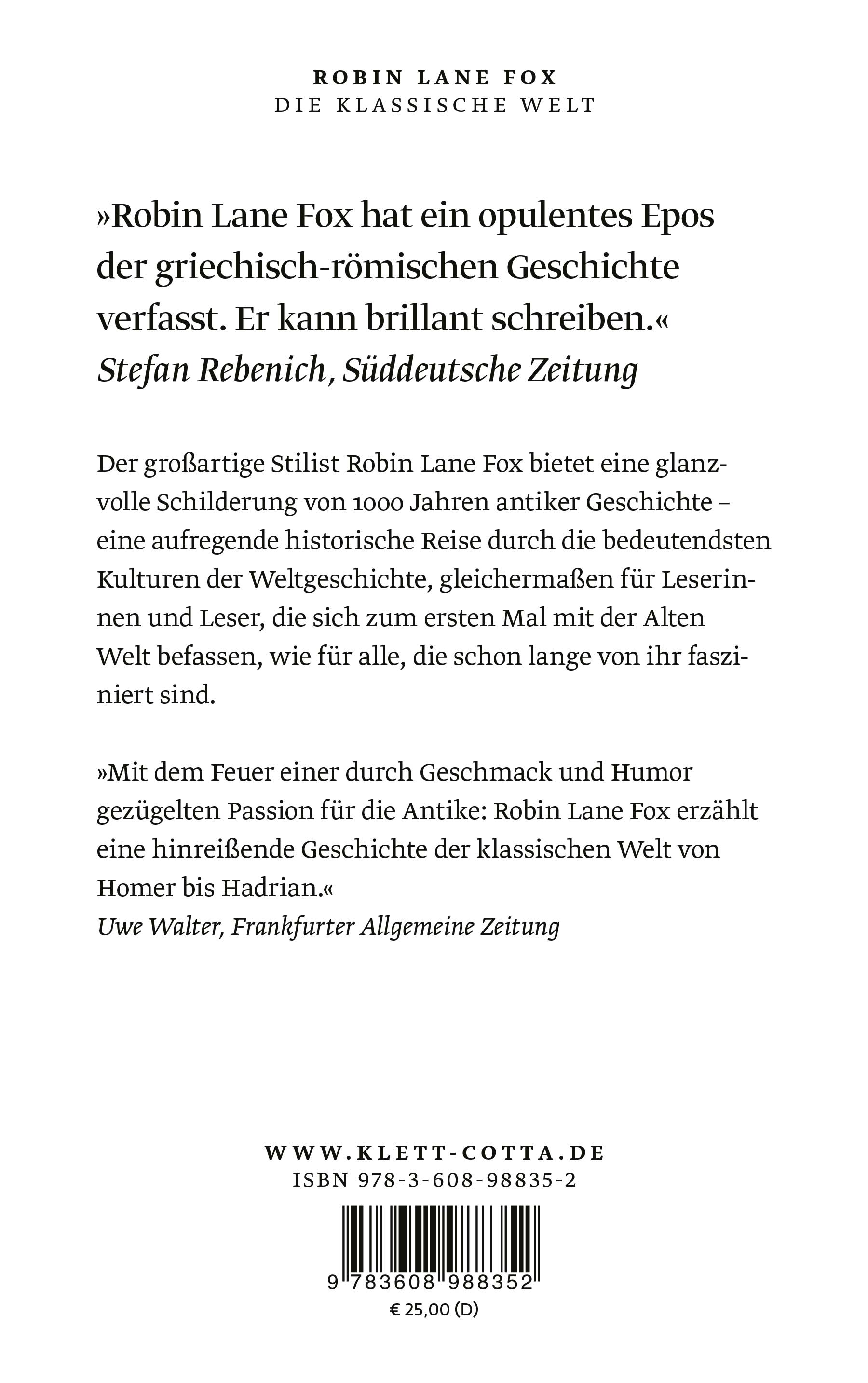 »Mit dem Feuer einer durch Geschmack und Humor gezügelten Passion für die Antike: Robin Lane Fox erzählt eine hinreißende Geschichte der Klassischen Welt von Homer bis Hadrian.« – Frankfurter Allgemeine Zeitung