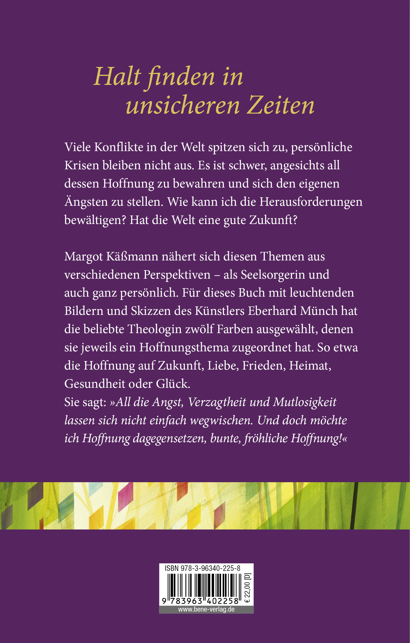 Margot Käßmann bleibt nicht bei den Ängsten stehen, sie weiß um die Kraft des Glaubens, die Kraft der Liebe und des Hoffens und sagt: "Für mich ist der christliche Glaube ein entscheidender Lebensanker. Gott kann ich meine Angst anvertrauen, in Gott kann ich Ruhe, Frieden, Lebensmut, Hoffnung finden. Das heißt nicht, dass es für Christinnen und Christen ein Leben ohne Angst gibt. Aber sie wissen, wo sie Halt finden können. Sie finden in der reichen Tradition von Bibel und Liturgie Gebete, Trostworte, Rituale und Ermutigung. Gemeinsam dürfen wir hoffen. Und wir sind aufgefordert, für unsere Überzeugungen einzustehen!"