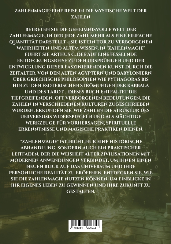 Zahlenmagie: Eine Reise in die mystische Welt der ZahlenBetreten Sie die geheimnisvolle Welt der Zahlenmagie, in der jede Zahl mehr als eine einfache Quantität darstellt - sie ist ein Tor zu verborgenen Wahrheiten und altem Wissen. In "Zahlenmagie" führt Sie Arthus C. Dee auf eine fesselnde Entdeckungsreise zu den Ursprüngen und der Entwicklung dieser faszinierenden Kunst durch die Zeitalter. Von den alten Ägyptern und Babyloniern über griechische Philosophen wie Pythagoras bis hin zu den esoterischen Strömungen der Kabbala und des Tarot - dieses Buch entfaltet die tiefgreifenden, oft verborgenen Bedeutungen, die Zahlen in verschiedenen Kulturen zugeschrieben wurden. Erkunden Sie, wie Zahlen die Struktur des Universums widerspiegeln und als mächtige Werkzeuge für Vorhersagen, spirituelle Erkenntnisse und magische Praktiken dienen. "Zahlenmagie" ist nicht nur eine historische Abhandlung, sondern auch ein praktischer Leitfaden, der die Weisheit alter Zivilisationen mit modernen Anwendungen verbindet, um Ihnen einen neuen Blick auf das Universum und Ihre persönliche Realität zu eröffnen. Entdecken Sie, wie Sie die Zahlenmagie nutzen können, um Einblicke in Ihr eigenes Leben zu gewinnen und Ihre Zukunft zu gestalten.