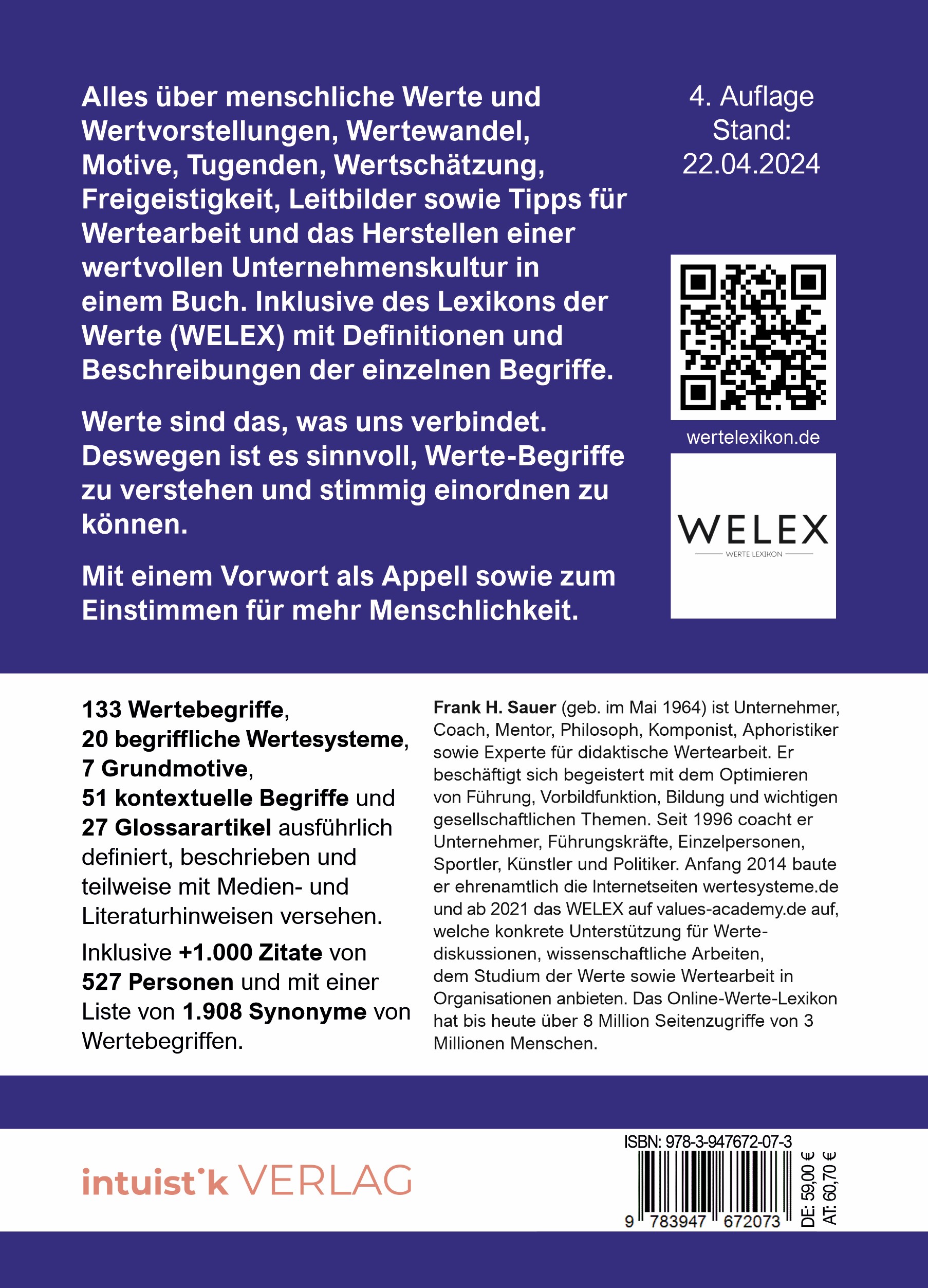 Alles über menschliche Werte und Wertvorstellungen, Wertewandel, Motive, Tugenden, Wertschätzung, Freigeistigkeit, Leitbilder sowie Tipps für Wertearbeit und das Herstellen einer wertvollen Unternehmenskultur in einem Buch. Inklusive des Lexikons der Werte (WELEX) mit Definitionen und Beschreibungen der einzelnen Begriffe.