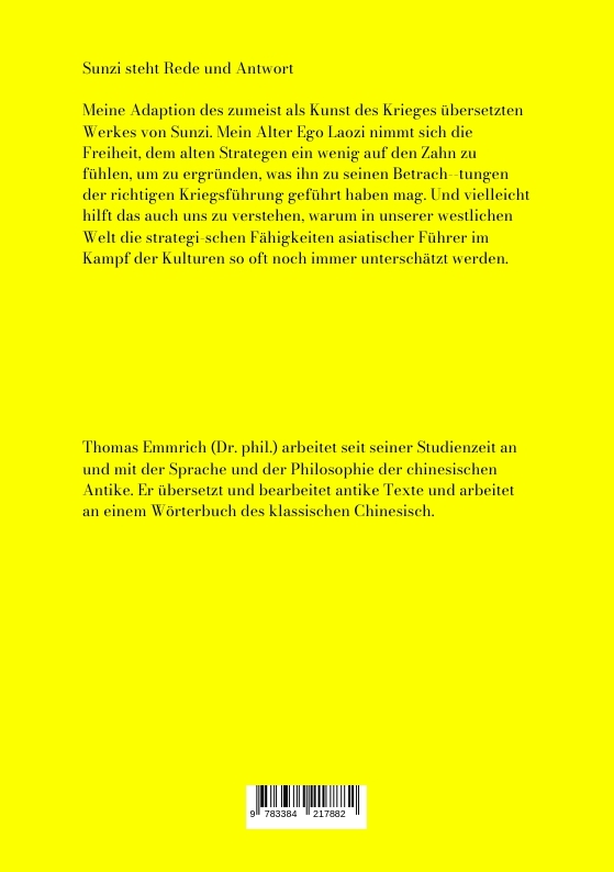 Dies ist meine Adaption des zumeist als Kunst des Krieges übersetzten Werkes von Sunzi. Mein Alter Ego Laozi nimmt sich die Freiheit, dem alten Strategen ein wenig auf den Zahn zu fühlen, um zu ergründen, was ihn zu seinen Betrachtungen der richtigen Kriegsführung geführt haben mag.Der von mir übersetzte Originaltext stammt aus dem klassischen chinesischen Altertum, das reich an philosophischen Ansätzen war, der sogenannten Zeit der Streitenden Staaten. Damals kämpften rivalisierende Feudalstaaten um die Vorherrschaft über das gesamte damalige China. Den Sieg errang 221 v. Chr. der Staat Qin unter der Führung von Qin Shihuangdi, der u.a. durch sein Grab in der Nähe von Xi'an bekannt ist und für seine vorbildliche Umsetzung der strategischen Ideen Sunzis gerühmt wird.Neben seiner grundlegenden Bedeutung für die Militärtheorie ist der Text ein wichtiger Bestandteil der Lehrpläne für die Managementausbildung, zumindest an asiatischen Universitäten. In unserer westlichen Welt werden die strategischen Fähigkeiten asiatischer Führer im Kampf der Kulturen oft noch immer unterschätzt.Das Werk von Sunzi besteht aus 13 Kapiteln. Die folgenden Gespräche ebenfalls.