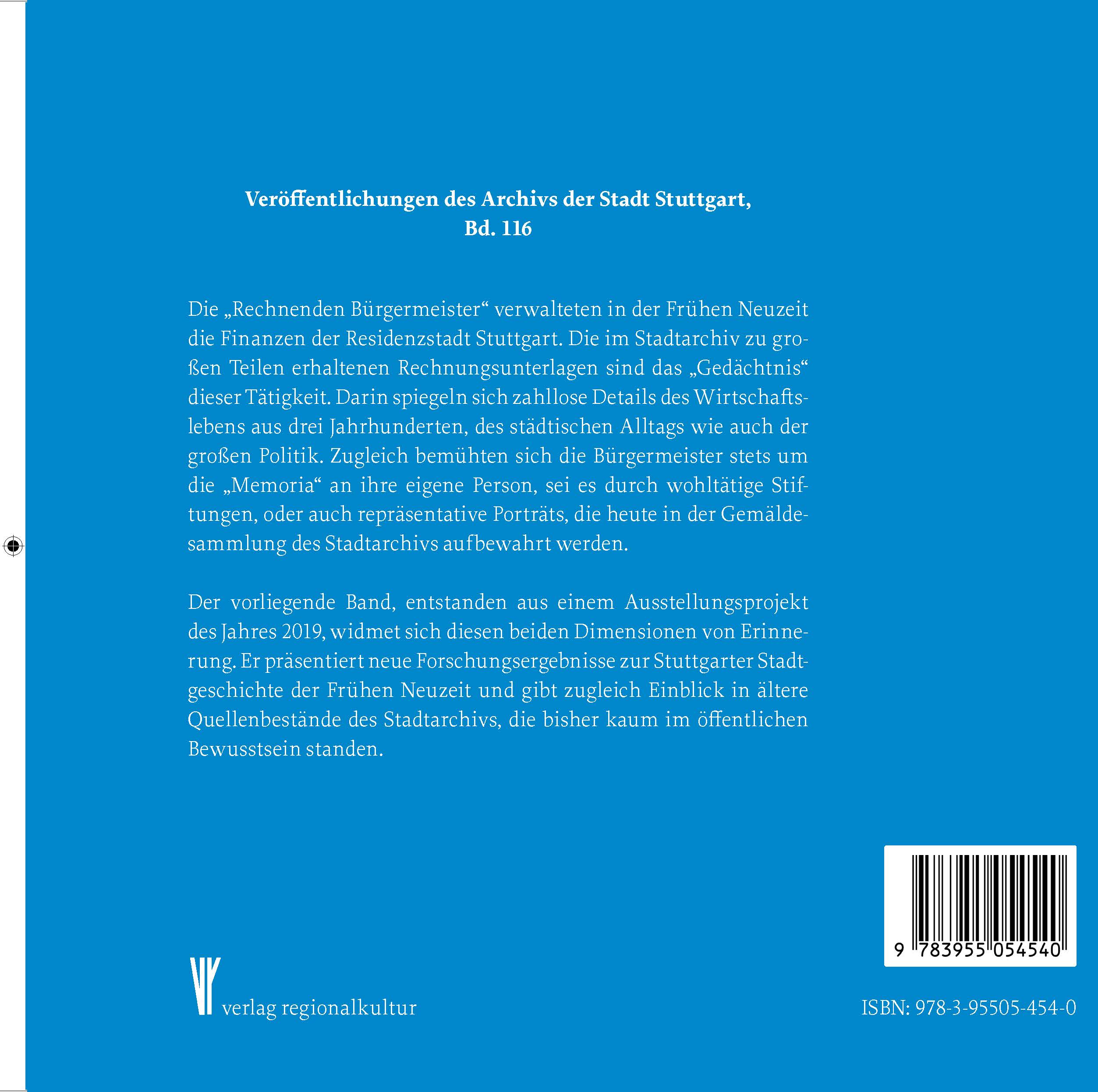 Die "Rechnenden Bürgermeister" verwalteten in der Frühen Neuzeit die Finanzen der Residenzstadt Stuttgart. Die im Stadtarchiv zu großen Teilen erhaltenen Rechnungsunterlagen sind das "Gedächtnis" dieser Tätigkeit. Darin spiegeln sich zahllose Details des Wirtschaftslebens aus drei Jahrhunderten, des städtischen Alltags wie auch der großen Politik. Zugleich bemühten sich die Bürgermeister stets um die "Memoria" an ihre eigene Person, sei es durch wohltätige Stiftungen, oder auch repräsentative Porträts, die heute in der Gemäldesammlung des Stadtarchivs aufbewahrt werden. Der vorliegende Band, entstanden aus einem Ausstellungsprojekt des Jahres 2019, widmet sich diesen beiden Dimensionen von Erinnerung. Er präsentiert neue Forschungsergebnisse zur Stuttgarter Stadtgeschichte der Frühen Neuzeit und gibt zugleich Einblick in ältere Quellenbestände des Stadtarchivs, die bisher kaum im öffentlichen Bewusstsein standen.