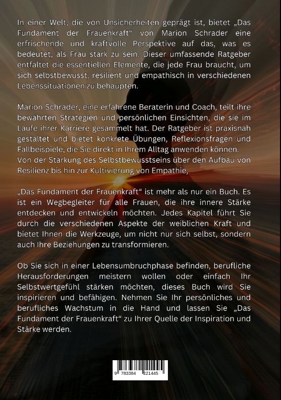 Das Fundament der Frauenkraft - Ein PraxisratgeberEntdecken Sie Ihre wahre Stärke durch Selbstbewusstsein, Resilienz und EmpathieMarion SchraderIn einer Welt, die von Unsicherheiten geprägt ist, bietet "Das Fundament der Frauenkraft" von Marion Schrader eine erfrischende und kraftvolle Perspektive auf das, was es bedeutet, als Frau stark zu sein. Dieser umfassende Ratgeber entfaltet die essentiellen Elemente, die jede Frau braucht, um sich selbstbewusst, resilient und empathisch in verschiedenen Lebenssituationen zu behaupten.Marion Schrader, eine erfahrene Beraterin und Coach, teilt ihre bewährten Strategien und persönlichen Einsichten, die sie im Laufe ihrer Karriere gesammelt hat. Der Ratgeber ist praxisnah gestaltet und bietet konkrete Übungen, Reflexionsfragen und Fallbeispiele, die Sie direkt in Ihrem Alltag anwenden können.Von der Stärkung des Selbstbewusstseins über den Aufbau von Resilienz bis hin zur Kultivierung von Empathie, "Das Fundament der Frauenkraft" ist mehr als nur ein Buch. Es ist ein Wegbegleiter für alle Frauen, die ihre innere Stärke entdecken und entwickeln möchten. Jedes Kapitel führt Sie durch die verschiedenen Aspekte der weiblichen Kraft und bietet Ihnen die Werkzeuge, um nicht nur sich selbst, sondern auch Ihre Beziehungen zu transformieren. Ob Sie sich in einer Lebensumbruchphase befinden, berufliche Herausforderungen meistern wollen oder einfach Ihr Selbstwertgefühl stärken möchten, dieses Buch wird Sie inspirieren und befähigen. Nehmen Sie Ihr persönliches und berufliches Wachstum in die Hand und lassen Sie "Das Fundament der Frauenkraft" zu Ihrer Quelle der Inspiration und Stärke werden.