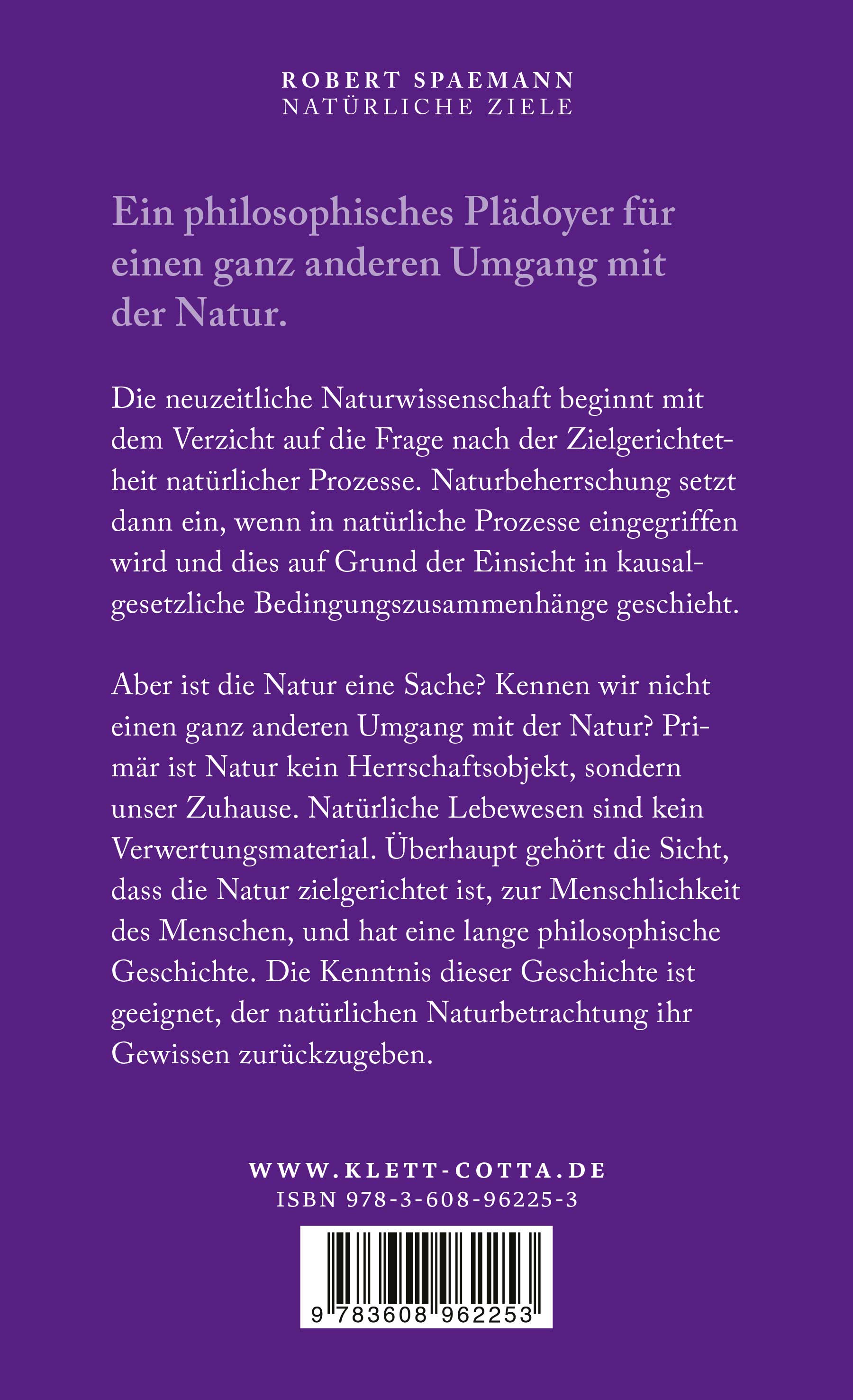 Aber ist die Natur eine Sache? Kennen wir nicht einen ganz anderen Umgang mit der Natur? Primär ist Natur kein Herrschaftsobjekt, sondern unser Zuhause. Natürliche Lebewesen sind kein Verwertungsmaterial, sondern Mitgeschöpfen - sie selbst sind zeitlebens auf etwas aus. Überhaupt gehört die Sicht, dass die Natur zielgerichtet ist, zur Menschlichkeit des Menschen, und hat eine lange philosophische Geschichte. Die Kenntnis dieser Geschichte ist geeignet, szientistische Vorurteile zu zerstören und der natürlichen Naturbetrachtung ihr Gewissen zurückzugeben.