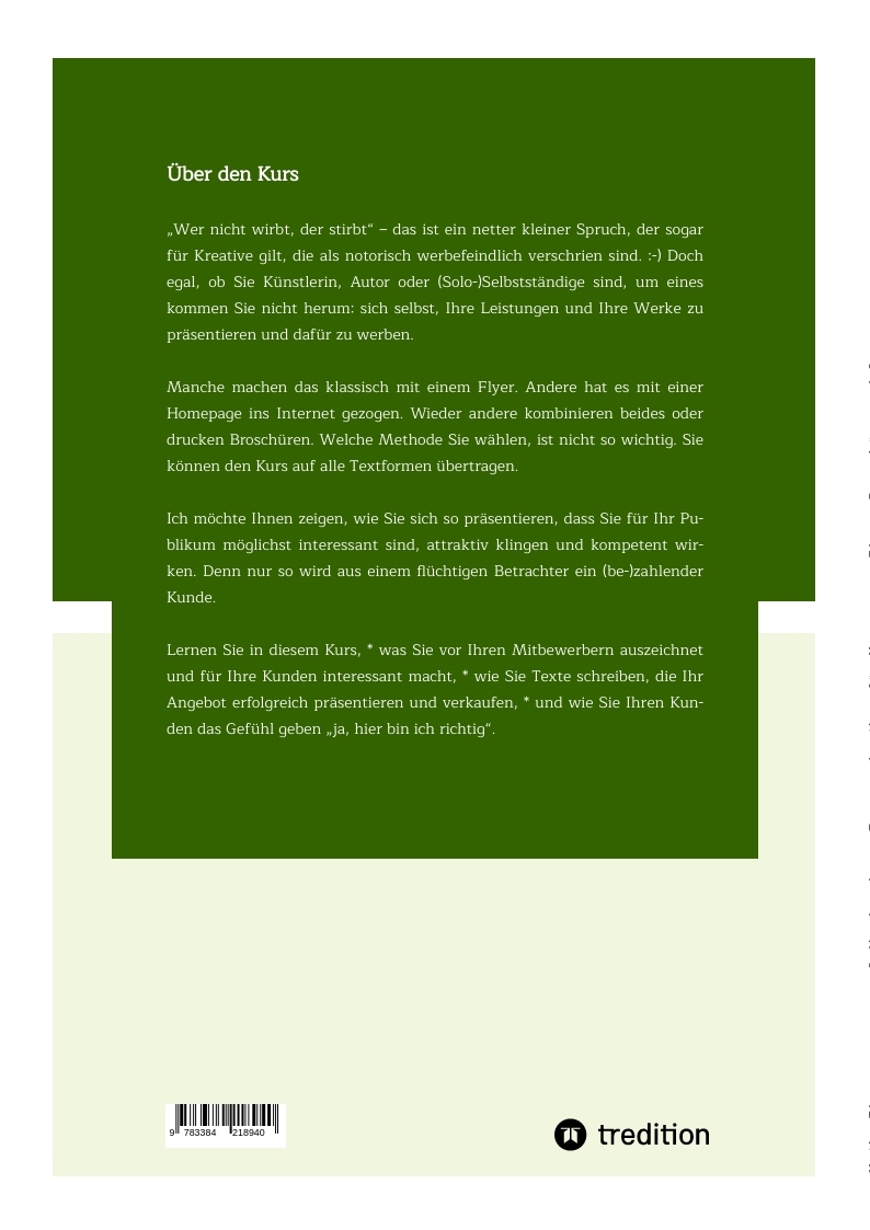 | Schlagworte | Angebot • Angebot bewerben • Autor • Autorin • autorin werden • Autor werden • Besser schreiben • besser schreiben können • besser schreiben lernen • Broschüre • Broschüre designen • Broschüre gestalten • Broschüre schreiben • Buch • Buchautor • Buchautorin • Buchautorin werden • Buchautor werden • buch bewerben • bücher bewerben • Coaching • Dienstleistung • Dienstleistung bewerben • eBook • E-Book • Flyer • Flyer designen • Flyer erstellen • Flyer gestalten • Flyer schreiben • Freelancer • Freiberufler • Freiberuflerin • Freiberuflich • gut schreiben • gut schreiben können • gut schreiben lernen • Hilfe • Homepage • Homepage designen • Homepage gestalten • Homepage schreiben • Kreativ • Kreative • kreativer • Künstler • Künstlerin • Kurs • Marketing • Produkt • Produkt bewerben • Ratgeber • Richtig schreiben • richtig schreiben lernen • Schreibbuch • Schreibcoaching • Schreiben • schreiben können • Schreiben lernen • schreiben online lernen • Schreibhandwerk • Schreibhilfe • Schreibkurs • Schreibratgeber • Schreibseminar • Schreibworkshop • Schriftsteller • Schriftstellerin • Schriftstellerin werden • Schriftsteller werden • Selbstständig • Selbstständige • Selbstständiger • Seminar • solo-selbstständig • Solo-Selbstständige • Solo-Selbstständiger • Texte für Broschüre • Texte für Flyer • Texte für Homepage • Texte für Webseite • Texte für Website • Webdesign • Webseite • Webseite designen • Webseite gestalten • webseite schreiben • Website • Website designen • Website gestalten • Website schreiben • Werbetext • Werbetexte • Werbetexte schreiben • Werbetext schreiben • Werbung • Werbung für Buch • Werbung für Bücher • wie bewerbe ich ein Buch • wie bewerbe ich meine Bücher • wie kann ich autorin werden • wie kann ich autor werden • wie kann ich buchautorin werden • wie kann ich buchautor werden • wie kann ich ein Buch bewerben • wie kann ich einen Werbetext schreiben • wie kann ich meine Bücher bewerben • wie kann ich schreiben lernen • wie kann ich schriftstellerin werden • wie kann ich schriftsteller werden • wie kann ich Werbetexte schreiben • wie lerne ich schreiben • wie schreibe ich einen Werbetext • wie schreibe ich Werbetexte • Wie werde ich Autor • wie werde ich Autorin • wie werde ich Buchautor • wie werde ich Buchautorin • Wie werde ich Schriftsteller • wie werde ich Schriftstellerin • Workshop |