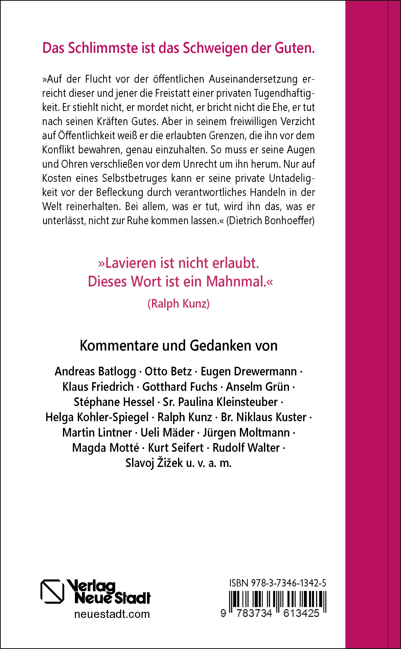 „Wer hält stand?”, heißt es in einem brisanten Text Bonhoeffers, der für seinen Widerstand gegen das NS-Regime bekanntlich mit seinem Leben einstand. Die Zeiten sind andere. Doch Bonhoeffers Worte haben nichts von ihrer Bedeutung verloren. (...) Das Buch der Stunde für alle, die Augen, Ohren, Mund und Herz in unserer politisch und gesellschaftlich aufgewühlten Zeit offen halten und den Mut nicht verlieren möchten.