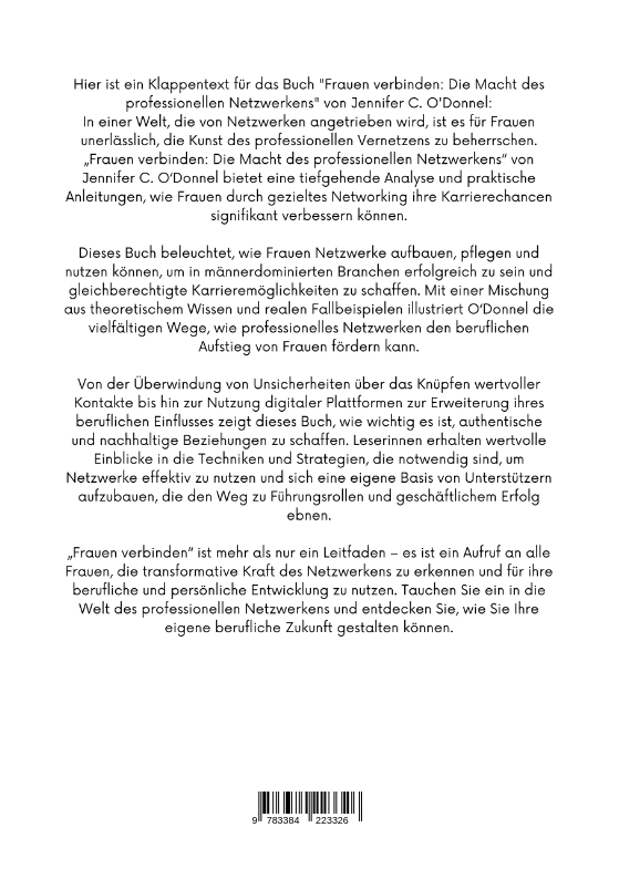 Hier ist ein Klappentext für das Buch "Frauen verbinden: Die Macht des professionellen Netzwerkens" von Jennifer C. O'Donnel:In einer Welt, die von Netzwerken angetrieben wird, ist es für Frauen unerlässlich, die Kunst des professionellen Vernetzens zu beherrschen. "Frauen verbinden: Die Macht des professionellen Netzwerkens" von Jennifer C. O'Donnel bietet eine tiefgehende Analyse und praktische Anleitungen, wie Frauen durch gezieltes Networking ihre Karrierechancen signifikant verbessern können.Dieses Buch beleuchtet, wie Frauen Netzwerke aufbauen, pflegen und nutzen können, um in männerdominierten Branchen erfolgreich zu sein und gleichberechtigte Karrieremöglichkeiten zu schaffen. Mit einer Mischung aus theoretischem Wissen und realen Fallbeispielen illustriert O'Donnel die vielfältigen Wege, wie professionelles Netzwerken den beruflichen Aufstieg von Frauen fördern kann.Von der Überwindung von Unsicherheiten über das Knüpfen wertvoller Kontakte bis hin zur Nutzung digitaler Plattformen zur Erweiterung ihres beruflichen Einflusses zeigt dieses Buch, wie wichtig es ist, authentische und nachhaltige Beziehungen zu schaffen. Leserinnen erhalten wertvolle Einblicke in die Techniken und Strategien, die notwendig sind, um Netzwerke effektiv zu nutzen und sich eine eigene Basis von Unterstützern aufzubauen, die den Weg zu Führungsrollen und geschäftlichem Erfolg ebnen."Frauen verbinden" ist mehr als nur ein Leitfaden - es ist ein Aufruf an alle Frauen, die transformative Kraft des Netzwerkens zu erkennen und für ihre berufliche und persönliche Entwicklung zu nutzen. Tauchen Sie ein in die Welt des professionellen Netzwerkens und entdecken Sie, wie Sie Ihre eigene berufliche Zukunft gestalten können.