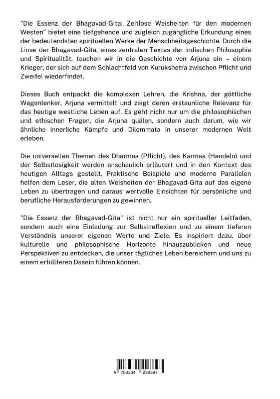 "Die Essenz der Bhagavad-Gita: Zeitlose Weisheiten für den modernen Westen" bietet eine tiefgehende und zugleich zugängliche Erkundung eines der bedeutendsten spirituellen Werke der Menschheitsgeschichte. Durch die Linse der Bhagavad-Gita, eines zentralen Textes der indischen Philosophie und Spiritualität, tauchen wir in die Geschichte von Arjuna ein - einem Krieger, der sich auf dem Schlachtfeld von Kurukshetra zwischen Pflicht und Zweifel wiederfindet.Dieses Buch entpackt die komplexen Lehren, die Krishna, der göttliche Wagenlenker, Arjuna vermittelt und zeigt deren erstaunliche Relevanz für das heutige westliche Leben auf. Es geht nicht nur um die philosophischen und ethischen Fragen, die Arjuna quälen, sondern auch darum, wie wir ähnliche innerliche Kämpfe und Dilemmata in unserer modernen Welt erleben.Die universellen Themen des Dharmas (Pflicht), des Karmas (Handeln) und der Selbstlosigkeit werden anschaulich erläutert und in den Kontext des heutigen Alltags gestellt. Praktische Beispiele und moderne Parallelen helfen dem Leser, die alten Weisheiten der Bhagavad-Gita auf das eigene Leben zu übertragen und daraus wertvolle Einsichten für persönliche und berufliche Herausforderungen zu gewinnen."Die Essenz der Bhagavad-Gita" ist nicht nur ein spiritueller Leitfaden, sondern auch eine Einladung zur Selbstreflexion und zu einem tieferen Verständnis unserer eigenen Werte und Ziele. Es inspiriert dazu, über kulturelle und philosophische Horizonte hinauszublicken und neue Perspektiven zu entdecken, die unser tägliches Leben bereichern und uns zu einem erfüllteren Dasein führen können.