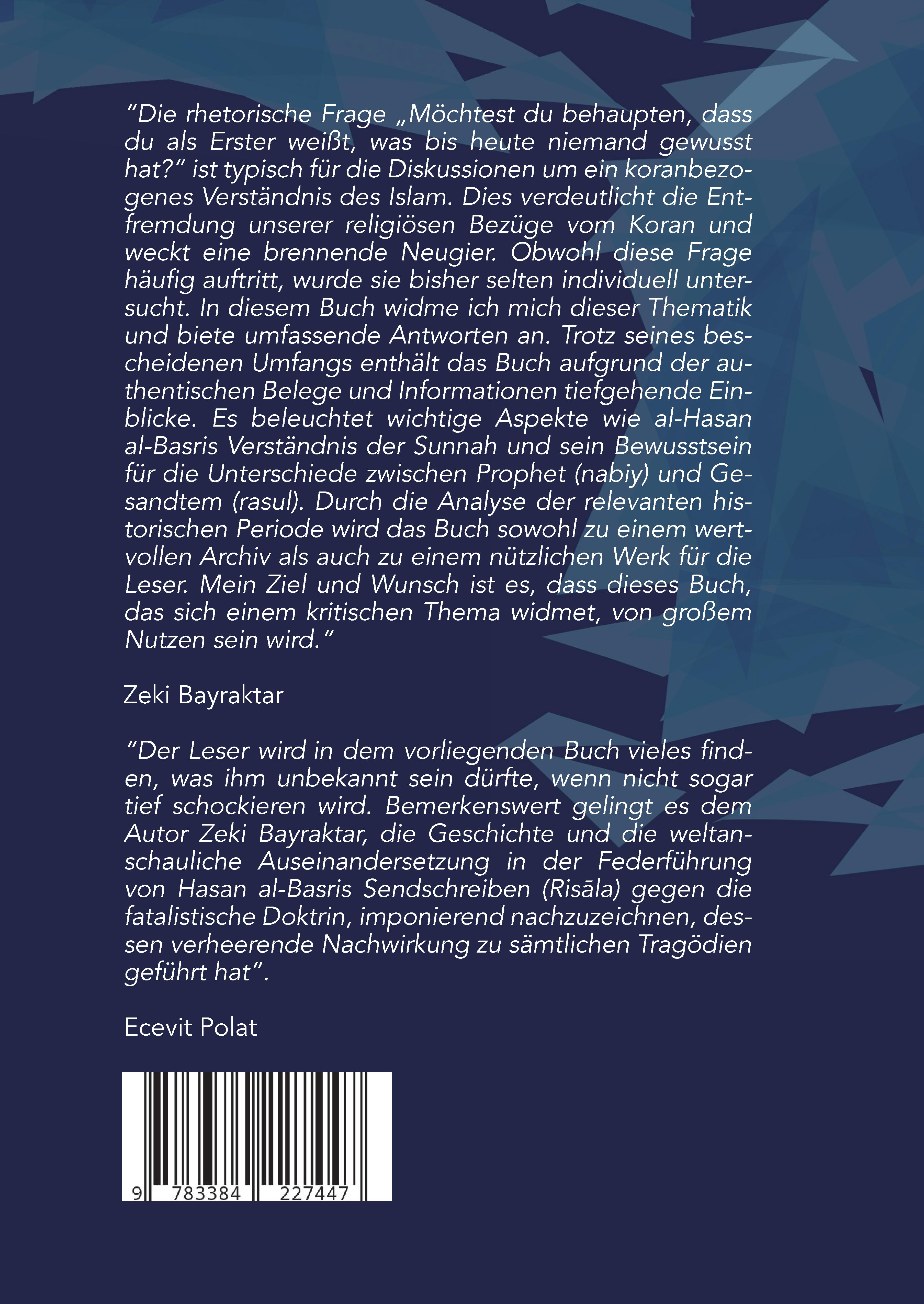 "Die rhetorische Frage "Möchtest du behaupten, dass du als Erster weißt, was bis heute niemand gewusst hat?" ist typisch für die Diskussionen um ein koranbezogenes Verständnis des Islam. Dies verdeutlicht die Entfremdung unserer religiösen Bezüge vom Koran und weckt eine brennende Neugier. Obwohl diese Frage häufig auftritt, wurde sie bisher selten individuell untersucht. In diesem Buch widme ich mich dieser Thematik und biete umfassende Antworten an. Trotz seines bescheidenen Umfangs enthält das Buch aufgrund der authentischen Belege und Informationen tiefgehende Einblicke. Es beleuchtet wichtige Aspekte wie al-Hasan al-Basris Verständnis der Sunnah und sein Bewusstsein für die Unterschiede zwischen Prophet (nabiy) und Gesandtem (rasul). Durch die Analyse der relevanten historischen Periode wird das Buch sowohl zu einem wertvollen Archiv als auch zu einem nützlichen Werk für die Leser. Mein Ziel und Wunsch ist es, dass dieses Buch, das sich einem kritischen Thema widmet, von großem Nutzen sein wird."Zeki Bayraktar"Der Leser wird in dem vorliegenden Buch vieles finden, was ihm unbekannt sein dürfte, wenn nicht sogar tief schockieren wird. Bemerkenswert gelingt es dem Autor Zeki Bayraktar, die Geschichte und die weltanschauliche Auseinandersetzung in der Federführung von Hasan al-Basris Sendschreiben (Risala) gegen die fatalistische Doktrin, imponierend nachzuzeichnen, dessen verheerende Nachwirkung zu sämtlichen Tragödien geführt hat".Ecevit Polat